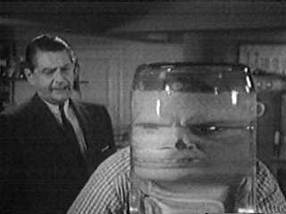 Roots, Shoots, and Other ComparesNot all the Best Brains are in Minnesota. There are various other movies where disembodied brains called the shots, plus a couple of other works that have the eye/brain motif.Donovan's Brain by Curt Siodmak (1942) – Strong willed, disembodied brain develops a telepathic link with a patsy. Made into several movies, including The Lady and the Monster (1944), Donovan's Brain (1953), and Ein Toter sucht seinen Mörder (1962, a.k.a. A Dead Man Seeks His Murderer, The Brain (USA), Vengence (UK)) See also the roots and shoots for Frankenhooker for a brief history of the brain transplant theme. Fiend Without a Face (1957) – Critters that look like brains with antennae go on a rampage. The Space Children (1958) – Alien space brain takes over the children of rocket scientists. (See also the roots and shoots for Beast with a Million Eyes for other examples of alien head games of the ‘50’s.) Journey to the Seventh Planet (1962) – John Agar vs. another brain. This time, the cranial critter is haunting a planet by making nightmares come true. The Evil Brain from Outer Space (1964) – Japanese superhero Starman (a.k.a. Super Giant) takes on an evil race ruled by the brain of a dead mastermind. Star Trek (1966 - 1969) – Two episodes are worth noting here. In "The Gamesters of Triskelion," the unseen backers of some gladiatorial games are revealed to be three disembodied brains. Elsewhere, some people desiring a climate control system in "Spock’s Brain" burgle the first officer’s central nervous system. A Gift from Earth by Larry Niven (1968) – Follows the idea that the eyes are extensions of the brain (as opposed to truly separate organs) by introducing a character with an unusual ability. He can telepathically force the irises of others to constrict the pupils. It may not sound like much of a talent, but it causes others to ignore him, which is a useful ability during an armed rebellion…. Brain Damage (1987) – Brain-like parasite has a taste for gray matter. (This is the easy part to explain.) The Brain (1988) – Giant brain with telepathic abilities goes on a feeding frenzy. (After it devours a slow moving scientist, a surprised character drolly comments, "That’s food for thought…") RoboCop 2 (1990) – Another example of the eye/brain motif. After the death of his body, the bad guy’s brain, along with his still connected eyes, are pulled from his body. It continues to sense its whereabouts. La Cité des enfants perdus (1995, a.k.a. The City of Lost Children) – It squeezes in so many elements from so many other stories, but would it be complete without Irvin, the talking brain? Mystery Science Theater 3000 (1988 - 1999) – Sure, the production company was called Best Brains, but they put their gray matter where there mouths were with the introduction of brain-in-the-bowl Observers in 1997. ("That’s thought for food….") See also The Astounding B Monster’s "Lobe