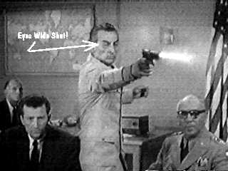 Mind BlowingFade to an important government building. (You can tell it’s an important government building by the fanfare in the musical cue.) Inside, military types lead by General Brown (E. Leslie Thomas), are looking over the reports of unusual activity near Indian Springs. Professor Tate tells them about the nature of the damage. They figure they have been invaded (and they know it ain't the Soviets) and discuss how this might affect the bomb test at Indian Springs. A stage-frightened extra brings in a message about Dan. "Death by intense radiation, same as the plane." The brass and suits leave for the test site and resolve to be ready for problems.Steve arrives at the Fallon place. Sally puts on a brave front while he explains that George was at his place and he's there to bring him back. When asked about the upcoming bomb test, he tells her that he's looking forward to it. And then he lapses into his megalomaniacal mumbling. Fallon (who is wearing that damn ugly sport shirt again) asks what he’s going to show them. Steve won't say, but he hints that it will make an impression like the bombing of Hiroshima. After dinner, they make small talk about washing the dishes. Fallon leaves (hopefully to go burn that shirt), and Steve starts putting the ambitious moves on Sally again. (Hard to tell which is tougher for Sally to take. Is it the lack of humility or the lack of restraint?) She tries to cut through the barrage of bragging to find out what he’s up to, but no luck. He tries the moves on her again, but no luck there, either. (For a Suped-Up Brain™ that considers himself darn near omnipotent, he takes that rebuffing thing well. Perhaps he thrives on failure.) Steve leaves in his car. George runs after it. The next day at Indian Springs, Steve talks to the Colonel Howell and General Brown. The two brass types explain to him that the meeting is Top Secret and his presence is not required. Steve counters by telling them that he knows what’s been causing the burn deaths. The general decides to give him two minutes. They go into a conference room with other brass and suits. Steve starts his presentation. As a visual aid, he directs their