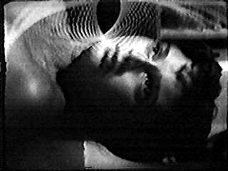 Next on their agenda is Bob. They put him on a slab and pump him with a syringe. Nadja leans over him with a surgical tool, sizing up a cut on the left chest. Outside, Tom and Sally are still wondering around trying to find the lair. Every once in a while, the movie interjects a quick romantic scene with them. (Yeah, that's what made the Western World so great; hard science and hormones.) But back in the lair, Hauron is working out the kinks in his new arm (which looks amazingly like his other arm). Nadja tells him that their instant body bank is dead. Hauron tells her that he thought this guy was too weak, and that's why he didn't just drop his current body and move into a new model. (And to this story's credit, I'm glad they put this line in there, 'cause we've been asking ourselves why he didn't do that in the first place.) Nadja looks at the dead boy and says he's got a nice face, except for a little scar. She stops talking when she remembers they've both got a couple of faces rougher than a back road in Louisiana. However, she still likes that chin.... Tom and Sally take a break from searching. Tom picks up a rock and throws it in frustration. (Not at Sally, dammit!) Instead of a thump, it makes a splash. Somehow, Tom decides this is significant, so he walks over to where the rock went. He finds a man made cave. (I believe the word "tunnel" might work as well.) Tom tells Sally about it and tells her to wait, but she'd rather go in with him. While they walk through the tunnel (which really does look like a cave, so how'd Tom know it was artificial?), they step into the path of that foot level electric eye thing. Inside, Hauron is sizing up his new chin. (Guys, do you have problems with the women in your lives trying to remake your image, too?) An alarm goes off. They turn on a stasis field. (Those of you who don't read a lot of science fiction, stand by; we'll get to it.) Nadja picks up a funky ray gun and goes to see what they've caught. Hauron remains behind, flexing his new chin (which, amazingly, has the same complexion as the rest of his face). Nadja enters the cave. Tom and Sally are standing there, but they've been stopped in mid-motion. Some kind of tiny sparks (which look like film scratches) fill the air, and that's the stasis field. Nadja puts on a big, evil smile. Hauron and Nadja call The Great Spud again. (So much for their radio silence.) He congratulates them on their good work. Then he tells them to stop calling him at home and use his pager instead. Nah, not really. But he does say they'll be told later when to send 'em over. In the background, Tom and Sally are stuck to a wall. After the conversation with The Great Spud, Tom starts asking questions. Hauron is happy to oblige, because he loves to talk shop and Nadja doesn't. Tom asks if that's really an intergalactic radio, but Hauron modestly says they're lucky to reach their own planet, which is in the same solar system. Then Tom asks what they're going to do with him and Sally, so Hauron, happy for an attentive audience, describes the relatively horrible body preparation. The final step, he explains, will be putting them in the deep fryer looking thing, and that'll transport them to the home world. After a couple more questions, Hauron tells Tom that the stuff in the tank is "like your hydrogen, but has a higher atomic weight." ("Your" hydrogen? What, are the laws of physics different where they come from?) Nadja interrupts this impromptu exposition so she and Hauron can get busy prepping Sally. Tom squeezes one more piece of information out of Hauron by asking how this high tech Post-It thing that's keeping him stuck to the wall works. Hauron tells him it uses an element they call dragonon (or something like that). The talkative spy tells the boy wonder that he doesn't know what it's called on Earth, but it glows in the dark and can burn the skin. End of conversation. Hauron activates