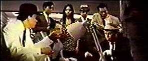 Elsewhere, Dr. Munakata (Nobuo Nakamura) is dumping diamonds into a dish. (This would be for people who find Grape Nuts too soft and chewy.) He gets up, goes to a window, and shouts to whoever is hiding out there to come to the window. Detective Komai (Yosuke Natsuki) reluctantly comes to the window. Dr. Munakata confesses he wasn't really sure there was anyone out there. Komai tells the elderly scientist that he followed someone to this house and asks to come in. While Komai comes in, Dr. Munakata looks at the dish. The diamonds are gone. Komai turns on a light and sees the toes of a pair of shoes peeking at him from under a curtain. The detective pulls back the curtain. Nothing there but the shoes; however, a European looking guy (Robert Dunham) leaps out from behind the couch. He claims to be a guest of the doctor, but then knocks out Komai with a surprise move. The gaijin grabs his shoes, apologizes to Dr. Munakata, and leaves. Outside, the girl from the earlier jewelry store robbery (hereafter referred to as Car Girl) is waiting for the foreigner. So are a few thugs. They "invite" him into a car. Back inside, Komai wakes up. The doctor's cute secretary, Masayo (Masayo), helps him. After a few polite pleasantries, they discuss the other guy. His name is Mark Jackson, and he claims to be a diamond broker. They talk about the earlier diamond robbery. A diamond ring, er, diamond robbery ring has been hitting several places worldwide. At the hideout of the diamond robbers, the bad guys discuss their failed theft and the weirdness during that event. Their unnamed, bearded big boss (Seizaburô Kawazu) decides the thing was some kind of trick. Enter Jackson at gunpoint. The big boss asks him who he is. Jackson tells him his name and trade (no serial number). The boss says there is no such person. Jackson says he's an unlicensed broker. They search him and pull out a big bag o' diamonds. Meanwhile, Komai takes Masayo and Dr. Munakata to police headquarters. He shows them pictures of the earlier robbery in town. The vault doors were melted like wax. During the conversation, Dr. Munakata tells Komai that he's a scientist and he's been working on methods to make artificial diamonds out of things like nylon and germanium. The ones stolen from his house were samples of his work. Instead of their value as jewelry, he's more interested in diamonds for their industrial use. Dr. Munakata and Masayo politely laugh at Komai when he doesn't get it. Back at bad guy central, they've figured out that the most they've gotten out of the evening is a bag of fakes. Jackson suddenly heads for the door while saying, "Guess I'll be going." One of the thugs knocks him out. The boss tells two of the thugs to take him to the garage for holding. Outside, Jackson jumps up and attacks the two thugs that were carrying him out. One of them realizes their prisoner was faking just before Jackson takes him down.