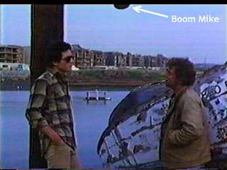 Sure, everyone may be hiding, but not our designated hero Wayne. He's walking along the canals looking for clues, and pauses at the place where the dropout duo was cultivating their cirrhoses. One of the liver losers jumps out at Wayne. (Ooooh! Scary-scary!) With nothing better to do in this scene, Wayne interviews the indigent gent. When the cut-rate columnist asks him if he saw or heard anything last night, the beleaguered bum claims he didn't hear anything. (Apparently, the soundman was concerned that he wasn't hearing anything after that last line. There's a long pause, and the boom mike dips into the top of the frame.) After some more Q & A that runs At a Slithis's Pace™, Wayne learns that there was another one there last night called Bunkie. Our never-wrong hero decides that if anyone knows anything, it'd be Bunkie.
