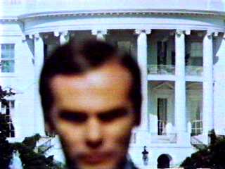 Back at Jack's place, Marion is setting up a romantic dinner. She walks out of the room to get something, so we are treated to twenty seconds of nothing happening. (Mind you, they're almost a pleasant twenty seconds….) Marion returns. While she's lighting some candles, Wolfman Jack silently enters in the background. She sees him, screams, and runs. She gets to the living room and picks up the revolver. He gets real close. Suddenly, the scene goes dark, and Marion shoots him in slow motion. (Helpful hint to filmmakers number 498: When you want a single shot go to slow motion, be sure to use a "fast" film and adequate lighting.) Enter the Attorney General, Salmon, and Dark Glasses. Wolfman Jack does the obligatory revert to Jack bit. Marion freaks out. Some extras help her out of the room. The others start to work on the cover-up. The story will be that Jack got in the way of a sniper's bullet that was intended for the President's daughter. The black reporter from before arrives. The Attorney General tells him, "Well, you won't have Jack Whittier to kick around any more." (Ah, but we will have this movie…) The End. Roll end credits over the White House at night. In a voiceover,