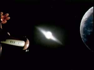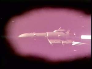 The last evacuation ship leaves the launch bay, pausing to pick up Eliot’s team. Needless to say, when Eliot learns what Rankin is up to, he immediately heads back down to lend him a hand. Meanwhile, Rankin enters an apparently deserted control room, only to have the monsters suddenly burst out from behind a wall panel. I have to admit, they may just be slime creatures, but they do have a highly developed flair for the dramatic. Rankin’s gun soon runs out of power (can’t you monitor the charge on those things?), and he repeats Eliot’s feat of chucking it and impaling one of the monsters. I suppose it’s possible that slime monsters would be porous enough for them to be easily skewered, but I am a little surprised that the clunky rifle would prove so reliably aerodynamic. Meanwhile, a now defenseless Rankin hops around the room, trying to avoid the deadly sparking tentacles. Just when it seems his goose is literally cooked, Eliot appears and provides some cover fire. The two briefly exchange some manly chatter, and then Rankin makes for the control panel. As Eliot holds the monsters off, Rankin engages the propulsion system and sets the Gamma 3 into the Earth’s atmosphere. (Unwisely, this is visualized by having the miniature model wobble around on a string.) Personally, I’d have sent it into the sun, but then I’m just a worrywart. Their task completed, they head out. However, the monsters are thick on