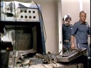 at this point it’s apparently held it for several hours.] Rankin makes to give the command, and Eliot attempts to stop him. "There must be another way!" he protests. (Dude, we don’t even know what the first way was yet.) Rankin, as usual, doesn’t have much patience for Eliot’s constant dillydallying. "When you think of it, let me know," he sneers. It’s really kind of hard to argue with him there. Then he gets on the microphone and issues the following order: "Prepare to evacuate C Block immediately, and make ready to drop the air lock panel!" Listen, I realize I’m a bit dense, but wasn’t that the original friggin’ plan?! In fact, wasn’t C Block supposed to be evacuated before you tried to lure the creatures into the storeroom? Yeesh. At this point Halversen appears, yelling that he has to collect his "papers." Apparently the idea of back-up computer discs, not to mention networked computer systems, has gone out of fashion. When Rankin denies his request, Halversen disobeys and runs down the hall to his lab. Those wacky scientists, huh? Meanwhile, Lisa has shown up too, and again, I have no idea why she’s here. Shouldn’t she be seeing to her patients, some of who are presumably in distress after the emergency evacuation? Meanwhile, a monster pretty much literally pops up right behind Rankin. I guess maybe it’s supposed to be the one that was in the sickbay, and it broke out. Or something. The party backs away, and then the rest of the monsters smash down the storage room wall and join in the attack. Luckily, guys in cumbersome rubber monster suits can’t move very quickly, and the crew mostly manages to stay out of their electrified grasp. However, Halversen shows up with maybe half a dozen file folders—that’s his lifetime of work?—and in a panic runs in front of the power cart. This sends the thing careening out of control down the hall…sort of. I really think they had only built maybe twenty or thirty feet of hallway, and thus again the camera stays really tight on things in an effort to hide this. Even so, it gets through, and the air lock button is pushed, and the door comes down, and Rankin has to do a purportedly exciting Indiana Jones leap and roll across the floor it to reach safety. Sadly (well, sort of), though, Halversen is still bumbling around on the other side of the door, desperately dodging the creatures. Well, that’s what happens when you ignore the hero’s orders. There’s another air lock door that can be deployed further down the hall, but the errant power cart is now wedged under it. Rankin orders it moved, and the men struggle to muscle it aside. Meanwhile, Eliot argues that they must raise the first door to save Halversen. Rankin predictably, if logically, shoots this idea down, as it might allow the monsters loose to threaten the entire the station. Eliot, who really is proving to be sort of an idiot, decides to take things into his own hands and goes to throw the switch. Rankin levels a gun at him and orders him to stand down. Sadly, though, when Eliot continues down the hall Rankin is stymied by Lisa throwing herself in the way. At this point you really want Rankin to just shoot both of them, but of course he doesn’t. However, when the door opens, it’s merely to set up the film’s most famous shock sting, as the face of Halversen’s mutilated and burned corpse fills the screen. Eliot pulls Lisa back, because she’s a girl and can’t do so on her own. Rankin covers their retreat by firing on the monsters, despite the fact that this will result in more of the beasties in short order. (Actually, that’s not necessarily true, if they can contain the monsters in C Block and then cut all the power there.) Luckily, the monsters are distracted by the power cart, and Martin manages to drop the second air lock door. However, for some reason (It’s In the Script) there are numerous barrels of flammable material stored behind a nearby wall panel. The sparking tentacles of the monsters manage to set these off, and a good portion of the station explodes, resulting in massive, billowing flames. That’s right, flames, in space. These are still seen about half a minute later when we cut to an exterior shot of the damaged Gamma 3.