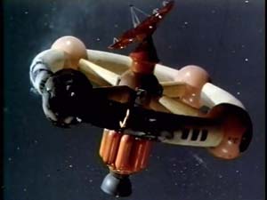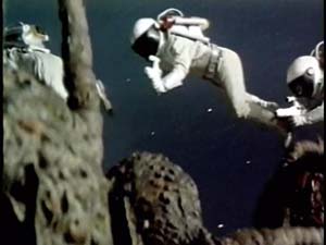 Rankin contacts Space Command and fills them in. He intends to evacuate the station, and requests tight quarantine for the arriving personnel and equipment when it arrives on Earth. (Yeah, you’d think.) Then he requests permission to destroy the Gamma 3. Eliot and everyone else appears shocked by this, although with the creatures infesting the station by the hundreds, I’m not sure what the hell else they would do. Of course, Eliot argues against it, and Rankin remains stalwart, etc., etc. You’d think Eliot might want to shut up after a disobeying direct order, with the result that a good chunk of the station has been vaporized, but I guess not. Eliot attempts to interfere again. (Again, how did this utter moron ever become the commanding officer of a gigantic space station?) Rankin orders him escorted to an evacuation vehicle, and to be placed under arrest if he offers up any further resistance. Eliot gets so tetchy at this that he takes a swing at Rankin. Of course, he’s not he-man enough to actually land a blow, and merely ends up getting socked in the face before being ushered out. General Thompson gives the OK for the station to be destroyed. However, the evacuation is blocked because the exterior of the "escape hatch," through which the vehicles are to leave, is crowded with slime monsters and won’t open. (Again, the effects here are awful. I actually believe the ‘monsters’ we see gumming up the hatch are finger puppets.) I guess that means that if this part of the ship had been destroyed, rather than C Block, that there would be no way at all to get the personnel off. The situation is reported to Rankin, who orders a party of four men sent outside to clear the monsters off. Of course, Eliot has proved such a noodle that the only course left for him is a Tragic, Redemptive Death. Therefore nobody is watching over him, and he is free to set things in motion. Having donned his spacesuit, he shows up and assumes command of the team. Lisa then pops in for the obligatory Tearful Last Farewell. She attempts to stop him, whereupon he barks, "Now don’t you tell me what to do! I’m tired of being told what to do! I’m tired of taking orders!" Well, then, maybe you shouldn’t have joined the friggin’ military, you ass. As if this doesn’t all nauseate us, then he whines about how Lisa never really loved him, she still loves Rankin, blah blah. Gad, what a dip. And so the team sets out, via a truly mind-bogglingly horrible array of clumsy wirework, inept bluescreen effects and laughably unconvincing miniature work. Obviously it’s more than a little unfair to compare the stuff here to modern effects work. However, even based on contemporary standards, it’s woeful stuff. After all, The Green Slime came out the same year as 2001: A Space Odyssey. No, the problem is basically that the script wrote some pretty big frickin’ checks, ones that were way beyond the capacity of the film to cash. Soon the party has landed on the hatch and begun blasting the monsters,