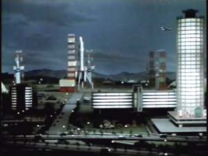 Our current object of inquiry opens in ‘space.’ The starry vistas, meanwhile, are accompanied by music that I believe can be heard in a plethora of other, cheapie sci-fi flicks. Sadly, the only version of The Green Slime commercially available in this country consists of a gruesomely pan-and-scanned video cassette.* Therefore, we see only the very edge of what presumably is meant to be Mother Earth rotating on the right side of the screen. This is soon mirrored on the left by an equally clipped portion of an enjoyably cheesy ‘space station’ model. [*Over the years, a goodly majority of films that I’ve really wanted to see on DVD—films ranging from Zulu to Them! to The Haunting to My Man Godfrey to Orca—have eventually been so released. One of the sole long-time malingerers on that roster has been The Green Slime, a film screaming out for a letterboxed, digital presentation. Oddly, the movie was, and presumably still is, owned stateside by MGM, the American company that originally co-produced the film with Japan’s Toho studio. MGM has, for a while now, been steadily releasing a wide array of their drive-in type titles on disc via their Midnight Movie line. So where the hell is The Green Slime?] Again, we are denied a full look at the tubular structure, but what we do see indicates the facility to be the U.N.S.C. Gamma. (Actually, we learn, it’s the Gamma 3.) Said initials, as anagram guessers might readily have conjectured, stand for the United Nations Space Command. Despite this, unsurprisingly, it appears that most of the actual work is done by Americans and members from a few select allies. We have seen the future, and it’s much like the present. We cut inside the Gamma 3, as realized by a set that isn’t much more convincing than the plastic model used for the exterior shots. The décor is all done in 1960s Futuristic, with the workers in jumpsuits resembling janitorial uniforms, monitor banks consisting of lots of curved white plastic and shiny chrome, dot matrix teletype printers and laughably archaic-looking computers with random blinky Christmas light displays. A communication officer contacts Cape Kennedy, and for some reason the reply from this facility is heard over the public address system. Does every transmission from Earth get played across the bridge? That sounds a little noisy, not to mention inefficient, but what do I know? In any case, Gamma 3 signifies that it is ready to transmit a "routine video weather report on Channel Five-Six. Solar magnetic influence minus zero-three-point-six-two." The future is an amazing place. We cut down to Earth, specifically your typical ‘patently bogus yet utterly charming’ Toho futurescape. This, naturally, is all rounded bubble buildings, rocket ship launch pads, wee plastic jetliners whizzing by on wires and tiny cars moving (all at the same clip) along a model raised highway. Soon we espy the UNSC headquarters, and cut inside to a control room that basically looks like a bigger version of the one on Gamma 3. Various wads of none-too-convincing technical chatter are heard. Meanwhile, the camera glides over to check out the gams of a blond office worker whose uniform, needless to say, partially consists of a mini-skirt. She hands in a report to her supervisor, who notes, "Same old garbage. Nothing exciting ever happens here." I don’t want you to fall out of your chair, but amazingly enough, something exciting then immediately occurs. Oh, the Irony! This is initially signified by "abnormal interference" on one of the