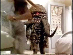 Soon security teams have been established and armed with laser rifles, and have begun searching the stations. When a security monitor in the control room goes down, a technician is sent into the station’s version of the Jeffries Tubes to check out the errant power conduit. (It’s nice to know that technojargon is universal.) For absolutely no reason whatsoever, overripe comedy music plays as he walks along, despite the red lobster claws we see waving behind him. Said music makes his inevitable horrible death all the more puzzling. Back in the Control Room, all the monitors go dead. Eliot is called to the location where the second technician was killed, and finds a body that looks much like the first. Then Eliot gets an emergency call over the loud speaker system—damn, you’d think they’d have something a little less public—urging him to hurry to the Main Power Room. There he finds a green beastie lying prone next to some equipment, and emitting a strange call. This creature boasts, er, rubbery skin, a single glowing red eye and, oddly enough, two long flailing tentacles right where a man’s arms would be. Boy, that’s a coincidence. Rankin grabs a laser rifle, and the two officers advance on the creature. The beast runs a tentacle on some equipment, resulting in a shower of sparks. Rankin begins to take aim at it, when Halversen comes into the room, yelling for him not to shoot. See, Halversen is a scientist, and wants the creature captured alive so as to Advance Science. Rankin, being a hardheaded military type, and noting that it’s apparently killed two men, wants to kill it. Man, that’s some original scripting there. Eliot agrees that they should probably at least try to capture it, which of course is meant to make him look weak. Of course, an obviously advanced alien lifeform is kind of a big deal, so at least trying to contain it doesn’t seem that unreasonable. Just to make sure that this doesn’t play well, however, Eliot seems to make up his mind out of pure mulishness when Rankin comes out against the idea. In any case, Rankin steps aside and Eliot orders the security officers to attempt to gas the creature and then throw a net over it. I’m not sure why a "gas gun" would be standard equipment on a space station, especially as it would seem to be more efficient to be able to send gas into a designated area through the air filtration system. On the other hand, nobody in the Star Trek universe ever seemed to figure that out, and crewmembers were constantly being taken hostage on those shows.* [*This used to rankle me particularly on Star Trek: the Next Generation, in which such shenanigans seemed to occur all the time. A knockout gas system would have ended half a dozen threats the crew faced over the years. Also, I’m no genius, but I always wondered why there seemed to be no frickkin’ security cameras on the Enterprise, and why the computer didn’t record all conversations. Privacy rights could be protected by requiring a special order from two members of the command staff to access them. Also, whether to respond to emergencies more efficiently, or merely to get crewmembers out of dangerous situations—such as, again, the marauders the ship was constantly host to—why didn’t they establish an intraship Emergency Transport Protocol? This would allow for security teams to be instantly transported to problem zones, or personal to be automatically beamed to safety at the speaking of a command code.] The gas guns prove to be rifles that shoot a stream of gas. (!) That doesn’t seem the best design, but what do I know? I mean, how is that better than a tranquilizer dart? In any case, the beastie is soon enveloped with white smoke, and then the net guns are into action. Since the nets are thus deployed from a distance, I again thought that trying to capture the creature made some sense. Suddenly, the creature rushes out from the bank of smoke, waving its tentacles like, say, arms in rubber sheathes. The nets are fired, and men grab the attached ropes and try to pull the beast down. However, sparks start shooting out of the thing’s tentacles and, I guess, burn it free from the nets. Then it continues forward, electrocuting anyone the tentacles brush against. Eliot almost buys it, but Rankin leaps forward and lasers the creature. This drives it off, although several more gruesome deaths occur in the process. Having given Eliot his chance, which he inevitably bollixed up, Rankin now takes command. No more of this capture the thing business; he orders the creature to be fired at on sight. Actually, as things turn out, Rankin’s ideas inadvertently are worse than Eliot’s. I’m not sure if we’re meant to notice that, but it’s true. I’ll discuss that at greater length in a while. Everyone leaves, with Halversen being the only one who seems to notice spatters of green blood on the floor. Hilariously, he tries to gather samples of it with a pair of tweezers (!) and a convenient Petri dish I guess he carries with him at all times. Lisa is tending to Eliot’s wounded shoulder in sickbay. Rankin shows up and asserts his intention to assume command. This leads to the inevitable showdown with Eliot, who forces Rankin to admit that he doesn’t believe that Eliot has the right stuff for command. "You make too many mistakes," he gruffs. When Lisa points out that the first alien lifeform is, in fact, sort of a big deal, Rankin snarls, "Tell it to the wives of the men in the morgue," and stalks off.