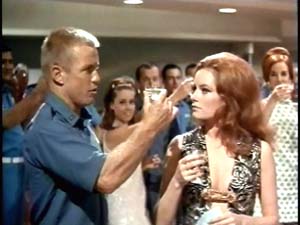 The monster emerges from its hidey-hole, although why it would cease suckling at a power source when it’s not actually being attacked is left to our imaginations. This is easily our best look at that monster suit so far, and let’s just say that it’s resemblance to Ronald McDonald’s buddy Grimace doesn’t go entirely unnoticed. Still and all, this is meat and potatoes for any monster movie lover, what with the mass of screaming nurses gathering up their patients while a guy in a rubber suit stands in the middle of the room waving its tentacles around. And, hey, the fact that you can occasionally spot the wires used to manipulate said tentacles just adds to the moment. Despite the fact that Rankin has ordered that weapons are not to be employed under any circumstances, all the security guards remain armed with laser rifles. The alarm sounded, they storm into the sickbay. I was wondering what they had hoped to accomplish when the head security guy began running around the chamber, yelling for the terrified nurses and patients cowering against the walls to "Get back! Get back, everybody!" Boy, good thing he showed up. Sure enough, despite the fact that you’d think they would just try to evacuate the room and then barricade the monster inside, they instead open fire. Making this especially dumb is that the creature isn’t actually attacking anyone. Admittedly, its waving tentacles are a menace, but all in all, it’s really just standing around. In fact, although they never really address how intelligent the creatures are, perhaps it’s come out in the open actually hoping to be attacked. In any case, the laser guns cut into it, and soon quite a lot of its green blood is spilling on the floor. Here Rankin, Eliot and Halversen make the scene, and Rankin only now, I guess, actually gives the order not to fire on the monsters. This had me pretty confused, since I couldn’t quite figure out the protocols for using the public address system. Given the apparent size of the station, and the fact that you’d presumably want to the weapons stand down command to be immediately promulgated, why wouldn’t you just issue it over the P.A. system? In any case, Rankin and Eliot distract the sparking monster by shoving wheeled hospital beds against it. (I couldn’t help noticing that the frames of these were made of metal, meaning that they should have been electrocuted.) Enraged, or something, the creature follows them into a side room, whereupon the two narrowly manage to escape and seal the alien in. However, the released blood is already starting to exhibit growth, and Rankin orders the entire sickbay cleared. Once the doors have been sealed, he uses the security cameras to see what’s happening. It turns out that the wounded monster is capable of healing itself, meaning that they will be almost impossible to kill. Meanwhile, the blood tissue quickly gains mass and soon has spread all over the room. Soon any number of creatures seems to be emerging. This is actually pretty neat stuff, although the tension is somewhat undercut by the weirdly comical background music. Note to composer: the xylophone is not an instrument that naturally lends itself to fostering suspense. After sitting there watching all this, Eliot decides to get on the horn and order all power cut off to the sickbay. Rankin looks on admiringly, noting, "Smart move, Vince!" Yeah, wow, that’s some brainstorm there, I’ll say. Of course, it might have been even handier a couple of minutes ago, but whatever. Rankin tells Eliot to call for a meeting of all the station’s officers. Then a report is sent to Space Command, declaring the station to be quarantined. Rankin is next seen visiting the ad hoc sickbay, having a word with the wounded and giving them a manly thumbs-up. Lisa, seeing him, strides over and asks whether he’s really quarantined the station. Of course, she does so right in the middle of the patients, and he has to pull her aside to discuss the situation. She is upset because the quarantine endangers her patients, some of who require treatment beyond what she can provide. I realize the screenwriter probably thought that just having a female on the station who actually has a job was all futurey and progressive and stuff—because heaven knows, there weren’t really any female doctors back in 1967, I mean, who could imagine such a thing?—but there’s no excuse for making Lisa such a complete and utter moron. To date, she’s broken quarantine when the away team returned, all because she wanted to greet her boyfriend. Then she begins to discuss a sensitive command matter in the middle of a bunch of people. Finally, she bitches about Rankin quarantining the station. Hello, she’s a doctor. If she doesn’t understand the point of a quarantine, who would? She should be arguing for the quarantine, not against it. It’s nice that she’s concerned for her current patients, but a physician who would literally risk all of humanity to get care for a couple of dozen people isn’t just medically incompetent, she’s a monster. The lights start flickering. "What is it?" Lisa asks. "I’m not sure," Rankin replies. (Amazingly, it turns out that the problem is connected to the monsters’ habit of tearing up the stations wiring to suck off the electrical system. Go figure.) After he goes off to investigate, one of the nurses, who was apparently wounded earlier, begins to scream her head off. Man, they really have to work on discipline on this tub. Anyway, Lisa consoles her by running over and giving her a hug. From everything we’ve seen, I can only assume she received her medical degree from Leo Buscaglia U. Eliot is meeting with the officers. "Commander Rankin and I have doped out a plan we hope will work," he explains. (When did this happen? Didn’t they split up like five minutes ago?) Given what we’ve seen so far, ‘doped out’ sounds like a remarkably accurate turn of phrase. Meanwhile, I’m sure the me
