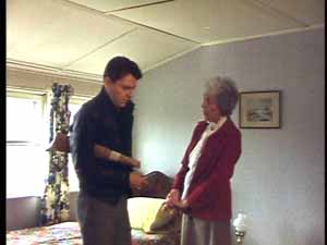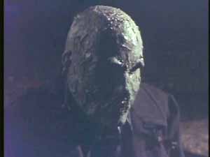 here.) The 80-minute rough cut of Dying Day is included on the first disc. Because the film wasn’t released, things never progressed to the point where post-production work was done. Therefore the film quality is shoddy, as it was never processed to acquire the normal professional sheen. There are also segments with no sound, or where the dialogue doesn’t match the lip movements, etc. For instance, the opening credits appear over animated images, but the sequence isn’t scored. It’s amazing that you’d ever consider the possibility of even the most hardened buff sitting through such a thing. On the other hand, I did, at least for this review, so there you go. Much more of a straight voodoo revenge piece, not a whole lot of Dying Day ended up in Raiders. Still, Morgan, Shelly and the Man in Black all originate in that movie. Piper also did special effects, and the more elaborate zombies seen in Raiders did indeed come from Piper’s film, while the more haphazard greasepaint ones were Sherman’s contribution. Although not a great picture by any means, Dying Day is actually a far better movie than Raiders ended up being—admittedly, not exactly a bold achievement—if only because it had, as you’d imagine, a much straighter storyline. However, it actually has more going for it than just that, although I don’t wish to exaggerate its quality. Certainly the film was fairly ambitious for a no-budget movie. For instance, it opens in 1897. On a dark and stormy night, a miscreant is being surreptitiously paid off by an apparently respectable man of property, one Mr. Randall. Said miscreant’s attempt at an olde-timey accent, by the way, is pretty comical. Upstairs in Randall’s house is a bound woman, the object for which the criminal was being paid. At this point, unsurprisingly, I thought Randall was intending to use her in some mad scientist experiment. She manages to get free before he arrives, and when he enters the room, gamely attacks him with a knife. (Hey, at least she’s trying. It’s also an example of why you don’t leave weapons in the same room as your kidnapping victims.) After taking a cut to the face, however, Randall knocks her out and begins tearing her blouse off, thus allowing for some rather sleazy boobie shots. Again, I was still assuming this guy to be a mad scientist or something of that sort. Instead, he apparently is just attempting to have his way with her. I was even more surprised when his depredations were interrupted by the appearance of a zombie, who proceeds to attack and kill Randall. The woman wakes in time to see the creature shamble off, and is naturally a bit nonplussed by it all. Next we jump to 1936, where, during a long and very poorly dubbed sequence, another member of the Randall family is eventually slain in a similar fashion. Following this we see a family tree chart with the names of several Randalls crossed out. Cut to "Last Spring," where we get our first sequence that appears in Raiders. It’s the scene where the zombie is chasing Morgan through the woods, which in Raiders occurs after he’s escaped from the barn. Except for a few inserts, it’s pretty much the same sequence, only here Morgan safely escapes after immolating his undead pursuer. From here we cut directly to the battered Morgan staggering down the highway, which in Raiders followed him being choked by the Man in Black. Here, however, the footage is narrated by Morgan. Again, he’s tagged by Shelly’s car, and again she stops and takes him to her house. I kind of liked the fact that when he wakes up later, a little confused, she lied about being the one who hit him. For a while, things progress as in Raiders, only sans Carstairs et al, and with scenes fleshed out a bit. After a bit where he has money wired to him (absent from Raiders), we see again Morgan purchasing his shotgun and renting his room. After that, however, we get the scene of the Man in Black raising the zombie that occurs in a severely truncated form in Raiders, when the kids are staking out the graveyard. Here a watchman is the one watching all this, and he ends up buying it. It’s this zombie, moreover, that later is hiding in Morgan’s closet when he returns from his date with Shelly. Said date proceeds, followed by the attack in the boarding house (although here the commotion more believably draws the landlady’s attention), and the subsequent police investigation. Notably, though, Kapek doesn’t return after his brief appearance here. The investigation plays out at significantly greater length and makes rather more sense. As well, the confusing timeline involving Morgan’s activities on this day, as delineated in the above review, isn’t nearly as problematic. For example, Morgan isn’t invited to a family dinner that takes place at what seems to be something like eleven o’clock at night. Here Morgan actually leaves town after the attack, whereas in Raiders he hangs around and somehow manages to not get arrested. Shelly’s finding of him makes her look a lot more clever, as she pieces together clues to figure out where he might have gone. (The theater with the 3 Stooges matinee she finds him in is actually another venue, which I could tell now that I was looking.) Morgan’s seemingly exaggerated shock at her appearance also makes a lot more sense in this context. Plus we get this line of narration as she drags him out: "They were showing a Stooges short, but it was Joe Besser, so I didn’t mind leaving." I thought that was pretty funny. Morgan lays the whole thing out for Shelly, who admittedly perhaps buys into the story a bit quickly (although the zombie body certainly would help). In an especially nice touch, however, she learns that Morgan intends to let the next zombie kill him. He’s just that exhausted from being on the run for over two years. Shelly’s reaction is also nicely clinical, since as a nurse she’s perhaps not as freaked out by death as most people would be.