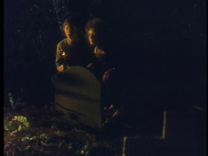 That night, Jonathon and Michelle stake out a small set that’s meant to match some footage taking place in a graveyard. "Look over there in the distance," Michelle exclaims, and sure enough, there’s a whole other movie going on over there. The Man is Black is standing over an open grave. He rings a small bell (get it?) and then pricks a barely healed wound on his wrist, spilling blood onto the revealed corpse. At this point I’d definitely have to say that magic is being used to make the zombies, although as discussed above, this seems to contradict earlier events. In any case, the zombie comes to life and opens its eyes. I
