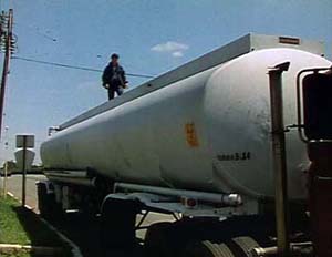 clarify the film’s not entirely self-explanatory title: We are the Raiders, of the Living Dead. Our *cough, cough* story proper kicks off with a POV shot from the cab of a fuel tanker truck as it cruises down a rural two-lane road. No, wait, it’s actually moving along a suburban residential…no, a four lane highway…no… Anyway, there’s a tanker truck driving around this roadway and that. This established (sort of), we proceed on to a guy in a car. A music sting and insert shot of his Colt .45 automatic alerts us to the fact that he’s most probably a bad guy of some sort. Soon we see that the Bad Guy’s car is right behind the tanker truck.