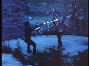 The main item on the disc is, however, a third (!!) version of the film, entitled Dark Night. This is Sherman’s original revision of Dying Day, and is a midway point between the Piper’s film and the eventually released Raiders of the Living Dead. It is, for instance, the version that introduces the Carstairs character. Here, however, Carstairs is the main villain of the piece, being the father of the Man in Black. The kids aren’t in the film, which allows for Carstairs to be a heavy, as well as removing the ludicrous homemade laser pistol angle. With Dying Day’s generational revenge angle removed, Dark Night is already markedly inferior to Piper’s original. Unsurprisingly, many, if not all, of the final work’s continuity problems originate here. It’s not as outrageous as Raiders, of course, lacking the terrorist opening and other problematic material. Still, perhaps the biggest laugh I got out of the set was when I scanned the promotional text on the back of the DVD case and read, "Sherman decided to re-shoot the film as Dark Night. Buyers were happy with the improvement in the film…" After reading that, I laughed out loud. Despite featuring much of the same material that appeared finished in Raiders, the 72-minute Dark Night print is much more problematic than that for Dying Day. A lot of the sequences are silent, including scenes that have sound in one or both of the other two versions, and there are even shots that pop up in black and white. Dark Night begins with a generally soundless edit of the Man in Black’s graveyard zombie resurrection. One oddity of this print is that, aside from generally looking like crap, the footage from Dying Day is often much better lit than in the final version of Raiders of the Living Dead. Apparently they processed the footage to make it darker, presumably to aid in the idea that it was taking place at night or in dark surroundings. However, this turns out to have been a really bad idea. Stuff that looks pretty good here can barely be seen in the final film. Check out the attack on Morgan in his boarding house for an example. We see a scene where (I guess) reporter Morgan’s editor is reading some notes he’s sent in, or something. Cut to Morgan stumbling through an obviously real life Halloween/Mardi Gras type affair taking place in, I think, New York City. Here is where he falls and is aided by Carstairs. Morgan is again taken to Carstairs’ office, but here when they enter, we see the Dr. removing the mystery gloves I mentioned earlier. I think this action was clipped out of shot in Raiders. Here Carstairs hasn’t yet been told about the zombies or Morgan having killed one (as this hasn’t occurred yet here), so his acceptance of Morgan not wanting to contact the police makes rather more sense. When Morgan does fill Carstairs in, it revolves around the scene with him and the Photographer heading out to the farm. Here they expect to witness some sort of occult cult ceremony, as established in dialogue heard here but clipped out of Raiders. Morgan enters the barn and things progress as they did in Raiders, including the eventual attack in the woods and zombie immolation that appears in all three versions. Here again the photographer is killed and Morgan left for dead, and onto the scene of him on the road, being hit by Shelly’s car, etc. Things progress as in Raiders for a while, although with more footage left over from Dying Day, presumably further trimmed in Raiders to allow for the subplot with the kids. Morgan gets his gun, rents his room, goes out for the date, is attacked in his boarding house, etc. Again, the zombie attack looks a lot better here, although the soundtrack isn’t complete. It’s too bad this sequence was so ruinously darkened for the Raiders revision. Shelly is again called to the boarding house, and again meets Kapek, who is again only the coroner and not a villainous mastermind. There follows a previously unseen bit where the fleeing Morgan calls Carstairs from a pay phone. When the conversation ends we see the Man in Black in Carstairs’ office and realize he’s a bad guy. However, the fact that Morgan would contact Carstairs is much more poorly motivated here than in Raiders. On the other hand, Carstairs being a villain makes his advice to Morgan, that he should avoid the police, a lot more believable. After the call, Carstairs talks to his son, noting, "These