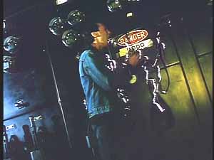 Cut outside, where Michelle is walking along the sidewalk with a large box of some sort. (We eventually learn that she’s stolen her family’s laser player, too, so that Jonathon can have more parts.) Soon two punks drive up beside her and begin with the hassling. The day is saved, however, when they are hit by pin-scratch laser beams, non-lethal ones, thankfully, and beat a hasty retreat. The gun does, however, make the traditional movie ‘cheeew!’ sound when it’s fired. Inside, Michelle thanks her hero for saving her. "Oh, that,"