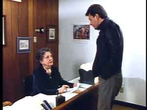 and muttering, "Duh! The police! I’m such a friggin’ moron." Meanwhile, Shelly arrives at the boarding house. The landlady reported that Morgan knew her and the investigating officer, Lt. Kruger, has asked her to drop by. Everyone seems to know everyone else, as you might expect in a small town. Of course, Shelly is also a nurse, and presumably would have come into contact with the police and coroner in her professional capacity. Needless to say, she’s flummoxed by the circumstances. Responding to questions, she admits that she had only met Morgan that morning as he came staggering down the road into town. "The car nearly ran him down," she explains, understandably shading the truth a bit. I like that passive voice, too, that’s very slick. Either because he’s a lousy cop, or a poorly written one, Kruger doesn’t inquire as to why she didn’t take Morgan to the hospital instead of home with her.