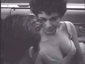 Once he comes closer to the camera, he turns out to be Pete. Perhaps Pete is so intrinsically zany in his own person that he warrants comedy music whenever he appears. In any case, he calls Harry and Beth together, noting that he wants to try a free fall from 5,000 feet, wanting to wait to open his ‘chute until the rather dangerous 1,000 foot mark. His suggestion is met with disbelief, as such antics could get the airfield in trouble with the FAA. Joe, looking on, proves as fascinated with the motives of these daredevil skydivers as any of us are. (Uh, right?) "What do you get out of altitude jumping?" he asks. "I don’t know," Peter responds. "I feel real free up there in that high blue sky. Nobody to tell you what to do, you just have to please yourself up there." (Man, I hope that doesn’t mean what I think it means.) Here I was hoping Beth would jump in with her "Maybe we jump because we’re scared, or to prove that we’re not scared" theory and kick off a further round of this fascinating discussion, but sadly it wasn’t to be. Furthermore, they unhappily also miss the opportunity to plumb Pete’s opinions on coffee. Harry gets Pete to promise to pull his cord at 2,200 feet, and they head over to a plane. Joe and Beth, meanwhile, remain behind to look on. Again, Francis ably suggests the plane in flight by staying very close on the actors, turning on a fan to blow their clothes and foleying in engine and wind noises. Eventually, they reach the proper *cough, cough* altitude, and Harry signals Pete to jump. He does so, and free falls for about three seconds before Joe warns, "He’s about 2,000 [feet]." Apparently he fell those first three thousand feet quick quickly. He and Beth wait for him to open his parachute, but it’s apparent that Pete’s decided to go with his original plan. "Why doesn’t he pull?" Joe gasps, and Beth replies, "Panic!" For whatever reason, Pete never does engage his ‘chute, and soon hits the ground. Well, anyway, at some point he’s on the ground, and the camera cuts to a shot of him lying prone. Beth and Joe run over, in an arm-pumping manner so reminiscent of the running man sequence in The Beast of Yucca Flats that I can only assume that Francis actually directed his actors on how they should move their body while in movement. They reach Pete’s body, which looks in surprisingly good shape, considering, although Beth does find a patch of stage blood on him. We cut to Harry and Beth conferring with an FAA inspector, who informs them that the field will have to remain shut down until the investigation is over. This puts the two in a bad spot, as the place is heavily mortgaged and they aren’t exactly cash rich. Meanwhile, Beth nearly broaches with Harry the subject of their troubled marriage, but backs off at the last minute. Later that day, Harry is seen parking outside a bar called The Sky Diver. (Man, that is one weird little burg.) He enters and gets a beer. He and his fellow afternoon lushes sit and drink and listen to songs on the jukebox until Suzy arrives. Needless to say, we don’t just see her enter the bar, but instead watch as she parks her car outside. You can never have too much footage of people in their cars. As she parks, Harry finishes up his beer and exits. I guess he’s psychic or something. No, wait, the whole things just a coincidence. As he walks in a different direction than that in which he had parked his car, they meet. Harry, however, has decided to break things off. "You’re a broad," he declares. Despite the fact that there are many more pertinent remarks he could have made, she takes offense and begins beating at him with her purse—at the time this was known as the Ruth Buzzi Maneuver—until he finally violently pushes her away. He leaves and she casts a "this isn’t over" glare at him. We cut to two people cavorting on a speedboat that night. Here the footage was so poorly lit that it took me a while to ascertain that the woman was Suzy, and I didn’t identify her partner as being Frankie until well after that. Not one to let the grass grow under her feet, our Suzy. They park the boat and get out onto the beach for a nauseating little From Here to Eternity moment. Well, at least they got the ‘eternity’ part right. Lying on a blanket beach, Suzy uses her wiles on the hapless Frankie. First, she tells him she can get him his job back at the airfield, which obviously doesn’t seem a very likely idea that this point. Even Frankie figures this out, and he’s not exactly the sharpest knife in the drawer. Then she begins talking about Pete’s accident. Frankie notes that he himself once panicked and was nearly unable to deploy his ‘chute, an incident that led him to give up the pastime. Finally, though, Suzy gets to the subject she’s really interested in. "Frankie," she ponders, "suppose somebody put acid in somebody’s ‘chute?" Frankie ponders this brainteaser, before offering that "Acid would eat holes in somebody’s ‘chute." Yep, nothing gets past ol’ Frankie. He also figures out where she’s going with this, and raises concerns about being caught, but she, er, distracts him. After making out for a bit, Frankie draws back. "Suzy, what makes you so mean?" he asks. Referring to a guy named Paul, who I can only guess was once her husband (although he’s a character we’ve not only never met but one whose existence has not been touched upon before), Frankie continues, "Paul gave you everything. Nice T-Bird, a speedboat, beautiful ranch, horses and cattle. You’ve got everything a girl needs." Suzy, however, rejects Frankie’s materialist values. "My Paul," she pensively responds. "He gave me everything. He gave me too much. We were always alone together. He didn’t think I needed anybody else. He followed me everywhere. Everywhere." This is mesmerizing stuff, although unfortunately we cut away before Frankie can ask for her views on coffee or the motives of skydivers. Joe joins Beth in 