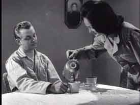 been established and thus comes across as a bit jarring. Bowing to the overwhelming dictates of what seems to be the Cosmos itself, Beth agrees to take Pete up. Director Francis, meanwhile, continues to undermine the viewer’s sense of linear space and time by suddenly cutting in a shot of a man inside a hanger, an image that bears little apparent ‘logical’ connection to that which has preceded it. This enigmatic progression further serves to dismantle the viewer’s sense of reality, as if one were suddenly finding oneself in a world in which the formalist Euclidian underpinnings of the thermodynamic universe itself were being displaced one by one, resulting in an absurdist, (de[form)alist] chaos of physical and chronological anarchy. In any case, Pete dons his parachute and