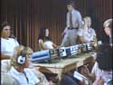 The report we see is on a woman who missed three payments on her furniture, whereupon the store repossessed it. To my surprise, the focus of the story wasn’t, "Local Store and Woman Freely Enter Into Contract, Woman Violates Terms of Same, Loses Furniture" but rather the opposite. The ‘rip-off’ occurring here, as I don’t see how it can be described as a ‘secret deal,’ even by these folks, is that the store didn’t just say, "Look, if you can pay us, that would be nice. Don’t worry about it, though." On the other hand, the woman in question is black and old, and was in the hospital at some point, so you can see how mean that was. As you’d expect from hippies, the student reporters don’t exactly have the entire ‘capitalism’ thing down. (Although I notice no one besides the store had been providing the lady with furniture.) "After you missed your payments," one budding Bernstein asks, "you found that they had destroyed your furniture [destroyed her furniture?] and repossessed it [what, after they destroyed it], and now they refuse to refund the money to you on which you had paid on it for two years before they had repossessed it?" First, glad the Freedom School’s ‘Yoga English Language’ classes are doing so well. Second, yes, when you go into default on a contract, they repossess the merchandise and keep the money you’ve already paid. Wow, way to blow the lid off this previously unknown aspect of contract law. Inside the store, the small sales staff is watching the report (it’s live?), thus probably tripling the amount of people seeing it. The manager moans that he didn’t want to repossess the furniture, but, you know, the not-paying-for-it thing. However, lest this makes him look too sympathetic, he also moans that he was "just following orders"—WHICH IS EXACTLY WHAT THE NAZIS SAID!!!!!—and also tosses off an ugly racial slur. After all, we wouldn’t want the lady’s Economic Oppressors to come off too well. Finally, though, the "home office" calls and demands he replace the woman’s furniture with new stuff, free of charge. "Those crazy, lousy kids," he complains. Yes, if it hadn’t been for them and their dog (a zany pop culture reference; look at me, I’m Quentin Tarantino… hey, that’s another zany pop culture reference!) you would have gotten away with it. ‘It’ being following through on the terms of the contract you and the woman legally entered into. Thanks for preventing that outrage, Mystery Gang! That’s how powerful the Freedom School TV reports have become, I guess. (And where is the "home office," and how can they possibly be seeing the report? I mean, college radio and TV signals generally travel about half a block, and that’s on a good day. This was well before cable, remember.) Meanwhile, I’m assuming the store started a new advertising campaign: "Buy your living room set at Phil’s Furniture, and if you miss three payments, we’ll replace your purchase with newer furniture for free!" In any case, it’s now obvious that the kid’s TV Station is on the verge of bringing Corporate Amerikkka to its knees. "It was shortly after that that they started bugging our phones," Jean elucidates, "and the FBI started making mysterious and routine calls to the school." Wow, mysterious and routine? Is nothing beyond their malign powers?! Anyway, what did they expect would happen once they started messing with the local furniture store? We then see one of these Gestapo-like FBI