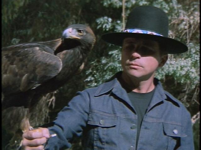 We cut to Billy sitting (presumably) naked in a sweat lodge. "I see it, Grandfather," he says to the apparently empty chamber. ‘It’ is a blue-tinted flame with shooting white sparkles cartoonishly superimposed before his face. Basically, it looks like one of those energy beings that were always economically invading the Enterprise on the original Star Trek. Meanwhile, Billy conducts a (I guess) telepathic conversation with Grandfather. Oops, wait, Grandfather is sitting in the lodge opposite Billy. We didn’t see him because the film’s DVD presentation is atrociously pan ‘n scanned, radically cropped from a 2.35 : 1 aspect ratio to fit a square TV screen. This is weird, actually, because Laughlin himself released the Billy Jack DVDs. For some reason he used what I assume is a TV print to put on the DVD, rather than a theatrical print, which I can’t quite figure out. You’d think he’d want to preserve the integrity of the film more than anyone else, especially given the fact that he’s always bent over backwards to associate himself with Billy Jack. "What color is [the flame]?" Grandfather asks Our Hero, and is told it’s blue. "That is a spirit looking to see if you are worthy," he explains. "It takes many forms." Then the flame disappears. "Where did it go?" Billy inquires. "When you can tell me where the flame comes from," Grandfather replies, "I will tell you where it goes when it goes out." Seriously, this is just generic mumbo-jumbo, and could just as easily have come from Master Po as he instructed young Grasshopper. As with Grandfather, Billy is speaking in a native language, over which we hear an English translation. The latter consists of him speaking in short, declarative sentences, relayed in a slight sing-song fashion. This is presumably an attempt to convey the flavor of whatever tribal tongue he is speaking in (lines that he sounds like he learned phonetically), but the effect is to make him sound like a learning impaired person reading from a Curious George book. From this we cut to a panoramic helicopter shot traveling along some beautiful mesa country. Soon we see Billy and Grandfather standing upon a magnificent butte. I have to admit, shots like this always make me queasy, as I suffer from severe acrophobia. "Grandfather," Billy asks via voiceover, "where will I look for my shadow demon?" Again, he is told it emanates from inside himself, and that it represents "all the evil in you that others can see in you, but you cannot." This goes on at great length, and I mean great length, but remains similarly murky and abstract. Then we get this, after Billy asks how he can recognize his evil side. "By the things in others that make you angry," he is told. "Whenever you get upset at someone or something, it’s because that quality that you’re upset about really exists in you." Well, guess what, that’s not even insulting dime-store psychology, it’s outright bullshit. So if I become angry upon seeing a rapist, or a child killer, or some moron in the KKK, I’m angry because inside I secretly want to rape woman or murder children or wear a sheet and expose myself to be a massive retard? Sorry, I don’t think so. It’s quite a leap from "we all have an evil side" to that sort of statement. Blah blah blah, and on we go. Even to the extent that Grandfather’s spiel is valid, it amounts to little more than a restatement of Michael Jackson’s "Man in the Mirror." Don’t try to change others, change yourself. Now, that’s all well and good, unless those others are pounding in your head while they force themselves upon your wife. As a Christian, I obviously believe we have a lifelong obligation to attempt to discern and confront our own inherently sinful natures, but this is taking that idea to a rather unworkable extreme. There’s definitely internal evil, but there’s external evil, too, and that must be confronted as well. And, in fact, Laughlin/Billy Jack knows this, because otherwise he’d become a pacifist like Jean. That would be admirable, but even Gandhi admitted that non-violence wouldn’t have worked against the Nazis. Billy asks for permission to "descend into the Cave of the Dead." (Oh, bru-ther.) Grandfather tells him he must first find his own vision, by which I assume he means a spirit guide. Then we cut to Jean, apparently sometime later, as she rides up on a horse to ask an Indian guy about Billy’s progress. He has been fasting, she is told, and awaiting his vision. However, she must go no further. "If a woman enters these sacred grounds, the medicine is lost," she is told. Jean jokes with the guy about this, but then placidly turns around and leaves. I wonder if she’d react so complacently if a Catholic priest was explaining why the Bible doesn’t allow for women to be ordained. Billy is heavily sweating atop a butte, sitting on the edge and with his feet dangling over the side. (Again, this fair gives me the heebie-jeebies. I’ll give Laughlin this; he’s a far braver man than I.) Meanwhile, Grandfather sits a short distance away, watching over him. Suddenly, a woman’s voice is heard. It’s the Vision Maiden, as played by Trinidad Hopkins (!), for whom this appears to be her entire thespian career. "Come, Billy Jack. Come, for I am going to show you the true nature of the White Man through all of history*. Come and look with me over this river of time." [*Good thing this wasn’t a white spirit telling a white guy about Indians all through history, because that would be racist.] "There’s St. Augustine," the Spirit suggests sarcastically, "preaching the Christian creed of Love to the Druid mumble mumble [yeesh, you’d think a Spirit Voice could speak up a little], with the tips of their lances dripping with blood." Oooh, burn! Snap! Oh, no, you did-int! You go, Vision Maiden! Anyway, during this another panoramic helicopter shot reveals the Spirit to be a woman dressed in traditional Indian garb, including, yep, a tall fea