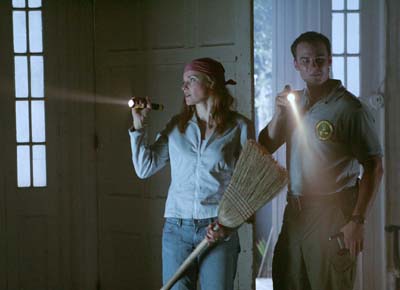 Even so, until just recently, CBS remained the network of older viewers, with such elder-friendly series as 60 Minutes, Murder, She Wrote, Diagnosis Murder, Walker, Texas Ranger, Touched By an Angel, etc. Things only began to change when CBS pioneered the reality TV craze with Survivor and The Amazing Race, both still running, and both still the genre’s class acts. The transformation to a younger audience became complete with the advent of the CSI shows and their even more numerous clones. Still, Sunday nights remained a problem, especially with 60 Minutes remaining the network’s lead-off show on those evenings. When NBC drew good ratings and favorable demographics last year with its popular if ludicrous disaster-themed miniseries 10.5, and CBS did well with its concurrent mini Category 6: Day of Destruction (the sequel to which runs this Sunday, Nov. 6th), the network ordered up a couple of animal attack TV movies. Back in March of this year, Locusts and Spring Break Shark Attack ran to decent ratings and comparatively young-skewing demos. The former featured an attack of bio-engineered bugs and starred Lucy "Xena" Lawless as voracious insect specialist Maddy Rierdon. It was a strictly by-the-book affair, and had much in common with the dreadful 10.5, especially in their respective heroines, who wore their gender like a +10 Cloak of Moral Superiority. (It must be said that 10.5 was much more obnoxious in this department, though, largely because of a grating, nails-on-chalkboard performance from Kim Delaney.) Thus anyone who disagreed with them, especially if there were a *shudder* male, was inevitably either a fool or just plain corrupt. As well, because it is assumed that the audience needs a heavy coating of Personal Issues to make up ‘care’ about the respective films’ cardboard-thin characters, both Lawless and Delaney were saddled with romantic attachments who complained that the ladies’ hard-charging, career-oriented focus left them feeling unimportant. Humorously, there’s little doubt that the writers of these epics thought the reversal of traditional sex roles in all this somewhat daring, although in fact over the last decade this has been as much of a cliché’ as the preoccupied male / frustrated female dynamic would have been in years prior. Probably my favorite part of the sequel was the fact that CBS ordered and telecast it (despite delays caused by the hurricanes that occurred during shooting) in a narrow six-month window. That to me calls to mind the halcyon days of schlock producers like Roger Corman and Sam Katzman, who would rush a cheapie film into production to capitalize on some big budget movie due out on the same subject. In any case, when last we left Maddy, she’d patched things up with her TV handsome, dedicated, sensitive, child-seeking hubbie Peter to the extent that they had an adorable baby in the film’s coda. Here we pick them up the couple a few years later. They now have two young children, and have relocated to Louisiana, where they both teach at a local college. (My first problem with the film was when I learned prior to watching it that Maddy wasn’t called in as a consultant on the mutated killer bat situation, but instead just happened to be in the exact bat epicenter when it occurred. That’s…quite a coincidence. The very person who saved the country from a plague of mutated locusts. What are the odds? And as I was to learn, it was even more unlikely than that.) The film opens outside a Mercier, LA cemetery, and we see a sign to this effect from an upside down perspective. Because, you know…bats and that hanging upside down thing. I was actually watching the movie at Joe Bannerman’s house, and enjoyed the fact that the film had him rolling his eyes in its very first seconds. The camera pans past the gothic gravestones and such, until we end up in a decrepit onsite chapel, in which lurks a colony of CGI bats. One such, needless to say, flies right into the camera--BOO!--and we cut to the film’s title. From here we ‘artistically’ cut to a driving beat-accompanied montage of unvaryingly hot college students going about their business (i.e., doing everything but studying). We quickly center on three such, a hot girl, a regular dude and their weird nerdy friend. We can tell the latter’s status because he’s wearing an army jacket, which I found especially weird because the first thing out of his mouth is a complaint about how hot it is. The weather is emphasized quite a lot, so I guess it’ll be a factor in why the bats are acting the way they are. Cut to a raucous frat party, with more loud music and lots of quick cuts of hot chicks in bikinis. Think of the opening of about half the CSI episodes ever, if you include the ones set in dance clubs, strip clubs and the life. The guys are all shirtless and buff and yelling, the girls are messing around on a beer-drenched Slip ‘n’ Slide, etc. This led me to theorize that the order from the network had been to Brundlefly the two previous animal attack films into one convenient package, with the result being more or less "Spring Break Bat Attack." While Locusts lacked the ‘WB Hot Teen’ emphasis (and by ‘teen,’ of course, I mean kids clearly in their twenties) so markedly on display in Spring Break Shark Attack, this film provides it in spades, with Maddy finding herself saddled with an entire posse of Totally Rad and Happening Young Hot People. You know what I mean, the kind of kids who under better circumstances would be up on a rooftop somewhere, jamming away with their multi-ethnic peers and fantasizing about teaching the world to chill. It’s here, by the way, that we get our first real scare. And it’s a doozy. This occurs when the words "special appearance by Brett Butler" appear on the screen. Yaaaah!! Meanwhile, the aforementioned Trio of students is walking through the previously established graveyard. (The girl quite nearly pops out of her tight straple