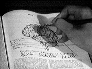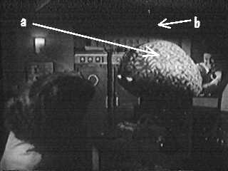 Roots, Shoots, and Other ComparesNot all the Best Brains are in Minnesota. There are various other movies where disembodied brains called the shots, plus a couple of other works that have the eye/brain motif.Donovan's Brain by Curt Siodmak (1942) – Strong willed, disembodied brain develops a telepathic link with a patsy. Made into several movies, including The Lady and the Monster (1944), Donovan's Brain (1953), and Ein Toter sucht seinen Mörder (1962, a.k.a. A Dead Man Seeks His Murderer, The Brain (USA), Vengence (UK)) See also the roots and shoots for Frankenhooker for a brief history of the brain transplant theme. Fiend Without a Face (1957) – Critters that look like brains with antennae go on a rampage. The Space Children (1958) – Alien space brain takes over the children of rocket scientists. (See also the roots and shoots for Beast with a Million Eyes for other examples of alien head games of the ‘50’s.) Journey to the Seventh Planet (1962) – John Agar vs. another brain. This time, the cranial critter is haunting a planet by making nightmares come true. The Evil Brain from Outer Space (1964) – Japanese superhero Starman (a.k.a. Super Giant) takes on an evil race ruled by the brain of a dead mastermind. Star Trek (1966 - 1969) – Two episodes are worth noting here. In "The Gamesters of Triskelion," the unseen backers of some gladiatorial games are revealed to be three disembodied brains. Elsewhere, some people desiring a climate control system in "Spock’s Brain" burgle the first officer’s central nervous system. A Gift from Earth by Larry Niven (1968) – Follows the idea that the eyes are extensions of the brain (as opposed to truly separate organs) by introducing a character with an unusual ability. He can telepathically force the irises of others to constrict the pupils. It may not sound like much of a talent, but it causes others to ignore him, which is a useful ability during an armed rebellion…. Brain Damage (1987) – Brain-like parasite has a taste for gray matter. (This is the easy part to explain.) The Brain (1988) – Giant brain with telepathic abilities goes on a feeding frenzy. (After it devours a slow moving scientist, a surprised character drolly comments, "That’s food for thought…") RoboCop 2 (1990) – Another example of the eye/brain motif. After the death of his body, the bad guy’s brain, along with his still connected eyes, are pulled from his body. It continues to sense its whereabouts. La Cité des enfants perdus (1995, a.k.a. The City of Lost Children) – It squeezes in so many elements from so many other stories, but would it be complete without Irvin, the talking brain? Mystery Science Theater 3000 (1988 - 1999) – Sure, the production company was called Best Brains, but they put their gray matter where there mouths were with the introduction of brain-in-the-bowl Observers in 1997. ("That’s thought for food….") See also The Astounding B Monster’s "Lobe