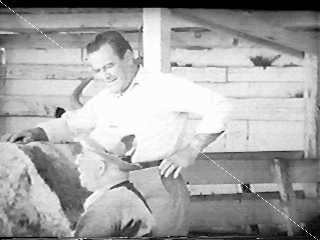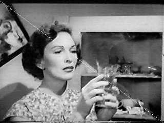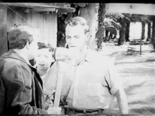 If I Knew You Were Comin', I'd a Baked a CakeCarol continues her work in the kitchen. While carrying a half-full coffee carafe, she hears a single high-pitched tone. Either The Outer Limits is on in the next room, or something weird is about to happen. (We'll be referring to this sound as the Cosmic Monotone.) The room darkens, as if a cloud is passing overhead. The sound intensifies. Carol screams as the carafe breaks and coffee spills. (The horror. Don'cha really hate it when good coffee goes to waste?) Then the sound fades off and the darkness passes. She runs to the window to look for whatever caused this.Cut to back to Sandy in the water. "Crazy pilots," she mumbles. "Always showing off." She gets out of water and notices Duke is shivering. As they walk, the dog looks up, stops, and barks at a threat. Sandy looks up and tells Him to come down from the tree. After he has done so, she yells at him, but backs off when she realizes she's yelling a simple minded mute. (Although we feel badly for Him's mental disability, we count it as a bonus that he can't speak. It eliminates the possibility that he'll slip into a bad Warner Brothers cartoon parody. For example, he won't be talking about hugging and squeezing Sandy and calling her George.) She tells him to move along back to the ranch. Then she notices Duke has wandered off. Carol calls the sheriff to file a complaint and report the damage. All of her glassware is broken. She's having trouble convincing the sheriff it's important. After the call, she goes over to the shattered china cabinet and picks out a broken goblet. She stares at it for a while. The sadness of her loss is interrupted when she runs into the kitchen and pulls her smoldering baking from the oven. We would not envy any man that walked in just now, so it only stands to reason that Him enters. Carol yells at him to get out. Cut to Alan driving. A bird hits his windshield. He stops to look at it. While he's out of his car, he's attacked by footage of a flock of birds flying at the camera. He jumps back into his car and rolls up the window, staring up at the sky. Later, Alan arrives at the farm of their elderly comedy relief neighbor