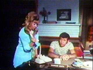 And our hero's back on the case again. He drops in on the home of Shawn Call. She used to be a dancer with Carrie. When she answers the door, she's tired. After all, it's only noon. Through the doorway, Charlie can see a man getting dressed. (By the way, it's the Ferg Flunky.) The detective asks the lethargic lady about Carrie. She hedges her answers because she thinks Charlie's a cop. He says he isn't, but tells her he's a private detective. She refuses to believe that; she's seen movies, and he doesn't look like a private detective. Finally, she tells him to come back later. After Charlie goes away, the Ferg Flunky asks Shawn about they guy at the door. He thinks Fergerson sent him. Charlie goes to the pool party residence of Wade the agent, who seems to have no shortage of scene distracting poolside girls. (Like we said earlier, it's almost a set-up for a musical number.) The agent doesn't know where Carrie is now, but he does remember that she was friends with Julie Richards, and Wade knows where she lives. Elsewhere, The Ferg Flunky talks to Fritz about a business proposition. He wants to undersell Frankie. Fritz doesn't like the idea, and as a visual aid, shows him the gap in his smile. Frankie did that to him. The photographer tells him to give it up. (He also calls him by name: Herb. Sorry, but we're sticking with calling him the Freg Flunky 'cause it's more fun to say.) Charlie goes to see Julie. The lights are out, but the door is unlocked. He lets himself in. Julie's in the living room. She's disoriented and asks Charlie if he's a bird. (OK, the lights are out and no one's home....) Charlie takes a seat and says he's looking for Carrie. Julie dances around the room for a while and tells Charlie to fly like a bird to find Carrie. She tries to float around the room but doesn't float so much as fall -- onto Charlie. The detective makes love to Julie. (That would be PG lovemaking. Your ethical view may vary regarding banging the drum slowly with someone who can't decide on a fixed plane of existence.) Afterwards, she tells him that for cherchez la femme, he should see Frankie Roberts, Carrie's ex-boyfriend. Go to a party at night. Enter Charlie. He passes through the groovy mod stuff happening at this scene, baby, and helps himself to some punch. (Heh, wonder what they've been using to flavor their Kool-Aid.) Frankie is at this party. While getting a cup of punch, he asks Charlie what he's doing here. The detective says he's looking for a woman. When he says his name, Frankie does a spit-take. (Would've been a cute scene if the reaction wasn't telegraphed.) Shawn Call is at the party, too. Charlie asks her about Carrie. She doesn't want to talk. They leave. And Frankie watches them go. And elsewhere in the room, apparently invisible to everyone else there, is Carrie. She's in her funky cat-suit, leaning against post and grooving to her own private Melodramatic Organ Music™. Shawn and Charlie go to the beach. They kiss. Fade out over the water. At Fergerson's office, the Ferg Flunky phrases to Frankie that the