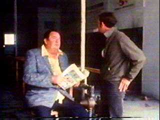 covered, she steps back and fades into the shadows. The Dame CurseNext day, Charlie is following another lead. He's at the mystic residence of Waco the hippie fortune teller, who keeps a small harem of flower girls. (Can a musical number be far behind?) Waco tells our hero that he once saw Carrie with a guy called Big Mac. Charlie asks where he can find BM, and the host with the most says BM has a pool hall on Hollywood Blvd. Cut to various shots of the seedier side of Hollywood Blvd. at night. In a voiceover, Charlie assures us of his people skills, ending with, "Watch how well I handle this, because I'm only going to do this once." He goes into a pool hall. Skipper Bret is shooting at a table. (No, dammit, he's playing pool at a table.) Charlie goes over to a table, but a stocky guy in the background tells him this is BM's table. Our hero says it's OK because he's an old friend of BM. While Charlie racks the balls and gets ready to break, he and the stocky guy laugh it up about what a ladies man BM is. And just as Charlie cues his break, the stocky guy lets him in on the gag -- he's Big Mac. Charlie's shot spins off to the left. (Would've been a cute scene if we weren't introduced to BM earlier in this picture.) Charlie and BM shoot a game. BM is all big guy congeniality until Charlie brings up the subject of Carrie. That's when BM slams the back end of his cue into Charlie's midsection. While our hero is doubled over, BM tells Skipper Bret to take him out and finish him. Outside, Skipper Bret roughs up Charlie. The maritime mountainoid makes the mistake of trying to intimidate Charlie by announcing that he knows who he is and what he does for a living. Our hero rushes Skipper Bret fast enough to take him down and runs for it. At the office that was robbed during the opening credits, a man (Herb Robins) answers the phone. He tells the caller that Fergerson isn't in and he won't be back until Monday. (We don't get a name for this office character, so let's call him the Ferg Flunky.) The next day (and by our count, make that the third day), Charlie passes by a theater marquee advertising The Maltese Falcon. While Charlie philosophizes in a voiceover about the importance of being tough in his business, the camera lingers over posters of Humphrey Bogart. Our hero says, "My whole life has been a movie, but I keep getting the reels mixed up." Charlie passes by a self service laundry. The owner Coley (Coleman Francis) sits inside. Our hero asks him what's happening. Coley says his business went bust because of all the people cheating him. (Art imitates life? Who knows....) Charlie asks if he's OK and, after a bit of small talk, pushes some money on him.