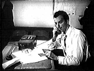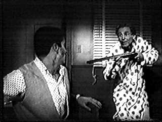 beats feet out of there. And What a Trip it WasAfter a few scenes, Tom arrives at civilization, where "civilization" is defined as a realty office with a "Public Telephone" sign over a padlocked door. Tom takes the sign at its word by picking up a rock and breaking off the padlock. He runs inside, finds the phone, and calls the sheriff's office. His call is routed to the chief deputy sheriff. (The credits say this actor's name is Lyle Felisse, but we know him better by another name. See "The Who Cares Stuff, Notes on the Cast and Crew" below.) The chief deputy takes the call and heads out to meet with Tom. Back in the realty office, an ominous shadow creeps up on Tom. He turns to see a man (Brian F. Wood) in his pajamas with a shotgun. He's got the drop on Tom. ("Last night I shot a juvenile delinquent in my pajamas. Why he got into my pajamas, I have no idea." Hahahahaha...aw, skip it.) He calls the operator and asks for a connect to the sheriff's office, but the operator tells him there was already a call from there to the sheriff's office. Although he's convinced Tom may be on the level, the gunman (who we learn is called Elmer) keeps Tom covered. Tom asks to make another call, but Elmer won't hear of it until he's heard the whole story.