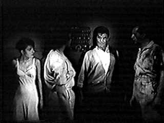 Meanwhile, Nadja and Hauron have finished prepping Sally. They already know Tom has escaped, and they also know that he wouldn't have left without the girl unless he was going to get help. Nadja takes Sally to another cave with no exit. Hauron gets ready for the anticipated return of the girl's friend. By this time, Tom has finished telling Elmer our plot so far. The chief deputy arrives with another policeman. They all go to check out Tom's story. When they get to Bob's car, they clearly see the signs of a struggle. (We don't, but let's play along.) Elmer tells the chief deputy that he doesn't believe this whole story because it depends on the existence of a cave, and there ain't no caves around here. (Come to think of it, this whole area doesn't look so much like Florida as it does Bronson Canyon. But let's keep playing along.) During all this, Hauron has been running through the woods with Sally's clothes. (No, carrying them. Phil Tucker wasn't that much like Ed Wood. Honest.) He pauses to drop them in strategic locations along his path. After he drops the last article, he sneaks back the other way. Tom has split off from the others. He finds one of Sally's bits of clothing. And then another. He follows the trail. Right into a cave. Where Nadja is waiting with her funky ray gun. She shoots. It makes a big explosion in the air, and Tom freezes in mid-motion (like in the stasis field). Hauron sneaks up on the other searchers. He lies down and vacates his body. The ball of light zooms at the spare detective, knocking him over. It's enough to mess up his arm. The chief deputy takes him back to town for medical help. They leave Elmer to guard the car. In the lair, they've got Tom and Sally stuck to the wall again. (We thought they were finished prepping Sally for her little trip, so we're kinda confused here.) Tom tries to bargain with them, knowledge for freedom. Not that it was part of his plan, but Sally lets it slip that there's a launch planned for this morning, and when they aren't there, the others will send help. They ask Tom how he got away, and the boy scout waves his watch at the control panel. He comes unstuck. He explains that that which they call draganon is what we call radium, and he has some one the face of his watch. (And that would cut him loose how?) Then Tom ups the ante by offering info on