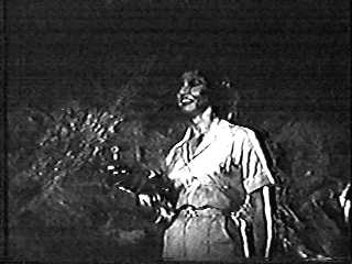 Outside, the police and company approach the cave. The chief deputy takes a bullhorn and tells the occupants to come out. General Hollister takes the bullhorn and does the same. (What's the implication here? Did the general think alien spies would be more impressed by a stubby soldier than a county mountie?) Inside, Nadja freaks on her associate, but the cool headed Hauron tells her what they should do. They're going to use a big paralysis ray to capture the others, then go back to the home world and make their report. When they get back, they'll be able to use the knowledge of their captives to stop the space program more effectively. General Hollister announces that this is their final warning. He trades the bullhorn for a semiautomatic pistol. That's when the action on screen suddenly fades to white with the sound of an explosion. Fade to Hauron and Nadja stacking Hollister, immobile and still holding his M1911A1, into a hole in the floor. (Or something like that. The budget must've caught up with the production at this point.) Hauron activates a switch, closing the door in the floor (or something like that). After Hauron tells the captives that they shouldn't bother escaping because the stasis field is locked on in the passage outside, he tells Nadja it's time to get tanked. Er, I mean, time to get into the tank. They vacate their bodies, and the balls of light settle into the deep fryer contraption and vanish. After their captors are gone, Tom tells Sally to reach over into his pocket and get his key chain. It has a small slide rule with radium on the face -- a gag gift for him to do calculations at night. (Aside from the pure geeky enthusiasm of something like that, and skipping the easy innuendo associated with Tom's suggestion and Sally's action, let's take a moment to suggest that the reason Tom may not be a hit with the ladies may have something to do with keeping radioactive materials in his pocket.) Sally waves the trinket over the control panel, freeing her and Tom. The two whiz kids revive the others. (We're not sure how they do this besides shaking them awake.) They decide they have to destroy the lair, which should turn off the stasis field in the passageway outside. Tom asks Dr. Martin if he has any litmus paper on him. Why, sure he does. (And if I didn't carry some of that stuff on my person for a month because I didn't bother taking it out of my jacket....) Tom tells the others the stuff in the deep fryer contraption is like hydrogen, but he dips the litmus into it to find out. Dr. von Hoften looks at the paper and says it isn't hydrogen based, but Tom asserts that it's still something like it. Therefore, the stuff in the tank will react like hydrogen at about a hundred fold! (Thump!) (::Ding::) (Ladies and gentlemen, this is your pilot speaking. As you've just felt, we've hit some turbulence. Please return to your seats and fasten your seat belts for this next little while.) So Tom says if the stuff in the deep fryer contraption acts like hydrogen, it should react with sodium chloride. (Thump!) Dr. Martin concurs, and he starts doing the calculations. They'll get a lot of heat. Dr. von Hoften says heat is fine, but they'll want an explosion. Science boy points out that polyethylene would be highly unstable in a mixture like that, so it would cause the desired explosion. (Thump-wham!) Getting the sodium chloride is easy, because he and Sally have packets of salt on them, leftover from the earlier picnic. (Bang-thump!) As for the polyethylene, it's a common plastic. Tom gets everyone to contribute all their belts and wallets. (Wham-bang-thump!) (Ladies and gentlemen, you may now unfasten your seat belts. However, more turbulence is always possible, so please remain in your seats. And as always, thank you for flying Aire Apostic.) (::Ding::) Tom dumps the salt, belts, and wallets into the deep fryer contraption while the others run out into the hall. The room begins to fill with smoke, and Tom runs out of there, too. The stasis field is still on in the hall. The laboratory lair explodes, and the stasis field fizzles out. Everyone escapes. (You can ask how they managed to survive the explosion if you want. But before you do, ask how badly you want to lie awake worrying about it.) Denouement. Everyone is congratulating themselves for getting rid of the monsters. Some of the group including Sally get into a squad car and drive away. The background music plays a few triumphant chords. But as soon as the car turns the corner out of our view, the musical cues suddenly hit a dramatic chord, followed by the sounds of a car crash and Sally screaming. Fade to black, with the two balls of light approaching quickly. Roll credits. The end.
