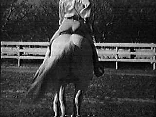 ContentsThe PlotAnnie Get Your GunmenGo to opening credits (white on a folksy rustic western drawing of a wall) and a medley that includes "Home on the Range." (Lookout! It's got the Monogram seal of reproval.) After the credits, we see Joan (Evelyn Finley) doing a riding demonstration for the camera. She puts her white (or "gray" if you are technical) horse through a simple dressage. (Mrs. Apostic used to ride show. I asked her, "Could you ride like that?" "Of course," she said.) After this, she does some trick riding, which includes standing while her arms are pointing up and her horse is at a gallop. For her big demonstration of talent, a blindfolded Joan rides with her body fully extended and parallel to her galloping horse, one foot in a stirrup and one hand on the saddle horn. ("I used to ride like that too," said Mrs. Apostic. "Only not on purpose.")