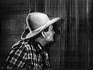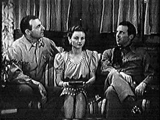 and Alibi will get jobs at the mine to keep an eye on things. The Big Spy CountryLater, at the mine office, Joan and Dan are doing some paper work. Fraser enters with Alibi. Dan "fires" Alibi for incompetence. After Alibi vows revenge, Fraser tells the potential disgruntled employee to meet him at Katie's place. Dan leaves, giving Fraser a chance to ask Joan for a date. While he's making his sales pitch, Denny enters and gets snippy with Fraser for asking Joan out. Tough talk follows, and Joan excuses herself. The two guys start fighting. Cue "exciting music." After about three minutes of phony blows and rearranging some of the furniture, Fraser is down and Denny excuses himself for his date with Joan. (Glad they were able to work something out. Maybe later, Denny will clean Fraser's clock for looking at his horse.) Alibi has gone to Katie's place, which is a bar way off the beaten path. It's the first time Alibi has been there, so he strikes up a conversation with the matronly owner (Edna Bennett) while her non-person husband Warner (Budd Buster) pours drinks. While they talk, Katie explains that this is the end of the line for cars because the road beyond is too rough for them. Alibi rants about what lousy management they have at the mine. Katie gives him a drink and goes to tend something else. While no one is watching, Alibi pours his drink into a spittoon. (Argh! Alcohol abuse.) Warner serves him another, and Alibi covertly disposes of that one, too. At the sheriff's office, Crash is getting spiffied up. Enter Slim (Johnny Bond), this picture's designated comic relief. Crash offers to make Slim acting sheriff, and his first duty will be to sweep out the office. (Insert obligatory observation of "acting" sheriff here.) After Crash leaves, Slim pauses his sweeping to look at the wanted posters. One of them says "Wanted for Murder" and has a picture of Adolf Hitler. Slim draws his revolver, points it at the picture, and drops the hammer on a couple of empty chambers. (Must be from the Barney Fife school of arms; his one bullet is no doubt in his shirt pocket.) Slim sits down in a chair, pretends to play the broom like a guitar (the soundtrack obliges) and sings this feature's deeply spiritual tune, "I'm Gonna Get der Führer, Sure as Shootin'." (Lyrics for this song can be found at this article's endnotes. How a goof sitting on his backside is going to be the one to lynch the leader of the Nazi party, we don't know.) Later, Slim tries on one of Crash's hats. It probably wouldn't look bad on the owner, but on Slim it looks like there's an aircraft carrier on his head. While he's admiring the effect in a mirror, the door behind him opens and an unseen assassin throws a knife. It sticks into the wall next to Slim. He freaks and runs out the door (and somehow doesn't run into whoever threw the knife). Crash and Denny are at Joan's. They're sitting on a couch with her while she looks through a recipe book for how to make fudge. Crash tells her he knows how. Denny scoffs, and the two silly suitors bicker over Crash's culinary skills. Joan threatens them by saying she won't make any fudge for them. They calm down. (Gee, wouldn't it have been nice if Fraser knew about this weakness. "Hey, Denny. If I give you some fudge, can I take Joan out? Maybe look at your horse, too?")