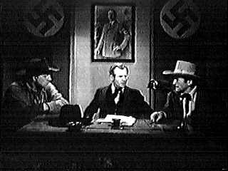 imagination until the very end, and that's too little too late, too. Life on the Range During WartimeThe imagination for this movie went into the plot device, and that's giving imagination more credit than should be due. Fans of Universal's Sherlock Holmes movies may recall how later entries in the series had the world's most famous consulting detective fighting Nazi spies instead of just plain old Moriarty. Several other series type movies from this period were injected with wartime flavorings. The only thing in Cowboy Commandos that distinguishes itself from other oaters is the novelty of Nazi bad guys. And as wartime propaganda, this gets ugly. There were two kinds of propaganda messages in the United States during World War II: "Work hard for our side (and buy bonds)" and "The enemy is evil. (Kill him and buy bonds.)" Of the second type, some filmmakers took the high road. For example, Frank Capra's Why We Fight series of documentaries took a relatively pragmatic approach to America's involvement in the war by explaining what the leaders of the Axis nations were doing before telling the audience that these men were evil and should be stopped. (Sidenote: Capra felt guilty about making propaganda -- until he found out, after the fact, what had been happening in Germany's concentration camps.) The low road for "the enemy is evil" was more like "the enemy is evil, ugly, stupid, and easily defeated. (Kill lots of them and buy some more bonds.)" This was the most common form injected into wartime adventure movies, and that's what we have here in Cowboy Commandos. The war comes to the Range Busters, not the other way around. One-sided wartime diatribes occasionally punctuate the dialogue. Slim's song fantasy about lynching Hitler might've been a crowd pleaser back then, but looking at it today, it's downright neurotic. Ah, well. At least it's not as psychotic as Gung Ho (1943), which was more at "the enemy is evil, ugly, stupid, subhuman Japanese that dies in droves. (Oh, and buy bonds.)" Compare that one to Nazi Germany's Der Ewige Jude (1940), which, uh, educated (for lack of better word) the audience about those "evil, ugly, stupid, subhuman Jews that should be exterminated in droves. (And buy bonds, er, build glory.)"