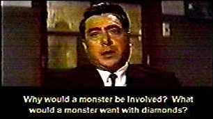 sky, several bright sparks flash. Diamonds Are a Monster's Best FriendMuch later, at Dr. Munakata's place, the scientist is looking at a photograph of the sparks. He tells Komai and Masayo he can't run a spectral analysis on this, but he thinks it could be a carbon substance. (That'd be a hit and a miss. Yes, he can't run a spectral analysis because it's a normal photograph. But there's no explaining why he thinks it's carbon. And, no, it's not supposed to be the levitated coal.) Komai's boss calls. He tells the detective to stop monster hunting and find out what Jackson is up to. Jackson is looking into windows at diamond stores. He goes a hotel. Nitta, a detective, is following him. Jackson goes to his room and sees the toes of a pair of shoes peeking at him from under a curtain. While he's pulling back the curtain and looking at a pair of empty shoes, Komai comes down from overhead. Komai asks the surprised (and mildly amused) foreigner where he went last night. Jackson tells him there is no time for this because someone is leaving soon. Komai won't leave. Jackson goes to a drawer and reaches for a pistol, but Komai stops him before he can lift it and takes it from him. The detective asks him if he has a permit for this and tells him he has to come down to the station. Jackson agrees, but runs for the door. Komai points the handgun at Jackson and tells him to stop, but the fleeing fellow continues opening the door. Komai tilts the pistol to the side for a warning shot and fires. Out the barrel shoot some delightful paper streamers. Jackson pauses to smile at the surprised detective before running into the hallway and closing the door. Naturally, Komai can't open the door when he gets to it. Later, Komai and Nitta return to headquarters. Their captain (Jun Tazaki) is politely dressing them down for letting Jackson get away. He reminds them of the shame this could bring on the department, and tells them there was another diamond robbery in Rhodesia. The thieves got the whole truck. That night, an armored car with diamonds is running along with no escort. The two guards see a body on the road and stop. After arguing about which one should get out and look, one of them finally does so. He tells the other guard it's a nice looking woman, so the other one gets out to see. (Yup, it's the Car Girl.) While this is happening, the diamond robbers are already in the back of the armored car cutting open the door. Just then, Jackson arrives, apparently uninvited by either party. The thieves grab a strongbox from armored car and beat it to another car, shooting at Jackson. Jackson pins them down with return fire. The two guards dive for cover by Jackson and ask if he's a policeman. He apologizes for not being one. Then, a coal truck wanders into the plot. Some of the thieves hijack the truck and charge Jackson with it. But while the truck is zooming toward Jackson, it slowly levitates up out of sight. The gang with the strongbox in their car takes off. After a while, the coal truck falls from the sky, smashing the armored car. The next day at police headquarters, it occurs to them that all the recent diamond thefts worldwide may be the work of the monster that lifted the coal from the factory. (Well, duh! We know a lot of weird creatures have shown up in the Japan of the Toho movie universe, but in what appears to be a single monster flick, you'd think they would've figured that one out by now.) During the meeting, Masayo calls and speaks to Komai. Jackson is at the Dr. Munakata's place. Jackson is showing Dr. Munakata a set of pictures from recent robberies when Komai and a squad of policemen arrive. Jackson was expecting them. He tells them he's been chasing after the thieves, too. When they put him under arrest, he shows them his credentials. He's a detective working for the World Diamond Exchange Commission. He offers his help, but they decline, telling the token gaijin that despite the fact he crudely knows their language, he wouldn't understand how their police force works. However, they do agree to let him go and conduct is own independent investigation. Meanwhile, at the bad guys place, the gang cuts open the strong box. Inside are bags of sugar candy. (No, that isn't one of my folksy colloquialisms. I really mean sugar candy.) Eiji puts a piece in his mouth and laughs. The big boss, who is understandably hacked off at this point, shouts at them. Back at Dr. Munakata's, Korino arrives. He has info on the monster. It's a cell from space that mutated after exposure to a pocket of radioactive particles in our atmosphere. (Uh, sure.) Why would it want coal? The doctor says for food. And since coal and diamonds are both carbon based, the monster seems to have a taste for both. (And just as Gentlemen Prefer Blondes, classy monsters from outer space prefer diamonds.) Then the doctor points out that as long as the monster has an ample supply of coal, they'll be doing OK. He's not thinking about the industrial crises of having no coal (and he isn't worried for Santa Claus having enough to go around, either); when the coal runs out, well, people are carbon based, too. Their conversation is interrupted when a levitating rock crashes