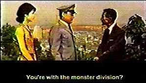 have been a shame. The Who Cares StuffNotes on the Cast and CrewMost of the people in this production, as we shall see, worked solidly for Toho. Yosuke Natsuki (Komai) was also Detective Shindo in San Daikaijű: Chikyu Saidai no Kessen (1964, a.k.a. Ghidrah, the Three-Headed Monster). Yôko Fujiyama (Masayo) was in Kaitei Gunkan (1963, a.k.a. Atragon) as the captain's daughter. Nobuo Nakamura (Dr. Munakata) appeared in both of Honda's Furankenshutain monster movies, which we know as Frankenstein Conquers the World and War of the Gargantuas. He did more work with Akira Kurosawa than he did with Honda. Robert Dunham (Mark Jackson) was Captain Martin in Green Slime (1969) and the emperor of Seatopia in Godzilla vs. Megalon (1973, US cut 1976). Hiroshi Koizumi (Korino) was Tsukioka the pilot in Gojira no Gyakushu (1955, a.k.a. Gigantis, or Godzilla Raids Again) and played learned science types in various Godzilla movies. Akiko Wakabayashi (The Car Girl) was also the possessed princess in Ghidora. She can also be seen in Kokusai Himitsu Keisatsu: Kagi no Kagi (1964). The title means International Secret Police: Key of Keys. You might know it better as the base film used for Woody Allen's What's Up Tiger Lily (1966). (The opening credits of that one say something like "Starring Nobody You've Ever Heard Of." Now we know better, don't we.) Those into Bond-age may also see her as Aki in You Only Live Twice (1967). Eisei Amamoto (Eiji) is one of the more recognizable character actors in Japan and achieved cult status playing outrageous bad guys. He can be seen as the evil Dr. Who in King Kong Escapes (1967) and Dr. Deathgod in the old Masked Rider series (early '70's). He was also in Kagi no Kagi (and therefore, What's up Tiger Lily) as the snake monger. Seizaburô Kawazu (The Big Boss) started acting in films during the late '30's for the time obscured director Kenji Mizoguchi. He may also be seen (or not) in Tomei Ningen (1954, a.k.a. Invisible Avenger). Jun Tazaki (Chief Inspector) played military types and sometimes learned men in various Toho features. In particular, he was the militant Captain Jinguji in Atragon. Susumu Fujita (General Iwasa) worked for Kurosawa in movies during World War II and appeared in several of his films throughout during the late '50's/early '60's, including Yojimbo (1961) and Tengoku to Jigogoku (1963, a.k.a. High and Low), and Kakushi Toride no San Akunin (1958, a.k.a. The Hidden Fortress). Ishirô Honda (director) started working for Photo Chemical Laboratories (PCL) studios before World War II. During the war, the Chinese captured him and he became a POW. After the war, he returned to work for the studio, which later became Toho, and formed a working relationship with Kurosawa. (Unofficially, Honda contributed to several of Kurosawa's films.) He directed a few action movies, but the one that made him famous was Godzilla. From there, he directed several Godzilla movies and various non-Godzilla stories for Toho. You could say that Godzilla was to Honda as Toshirô Mifune was to Kurosawa, but that depends on how much you like people looking at you funny. Jojiro Okami (story) also wrote the story for Chikyu Boeigun (1957,