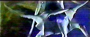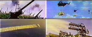 Air raid sirens interrupt the conversation. Radio transmissions report that radar shows something approaching. Anti-aircraft batteries gear up. Dr. Munakata, the general, and company arrive at military headquarters. Operations specialists are trying to track it, but they are having problems. They decide to use some high-powered directional microphones to see if they can hear it. They get something, but they don't think it's the monster. It sounds like a swarm of insects. Overhead, a reconnaissance plane sees what looks like a swarm of bees, but the pilot notes that this is too high up to see a thing like that. The swarm flies up into a cloud. While the recon group is reporting this, they see something else. Something is falling from the cloud. It looks like Michael Caine from The Swarm (1978), who is assuring the pilots that there is no bee. Nah, just kidding. Huge boulders fall out of the cloud. Down below, the hail of huge rocks smashes up the city while various extras run. That night, the rest of the diamond gang arrives. Car Girl meets them and tells them that Jackson's in his room. But while they walk further into the hotel lobby, they see Jackson coming through the front door. They move off to the side for cover. (He either didn't see them or he is being rude by not waving.) After he leaves the lobby, Car Girl says he was in his room earlier; he was answering the phone. Jackson goes into his room. Komai is already there. The police detective tells him he had four calls, no messages. He also tells him they know about the switch he pulled on the armored car diamonds. Where did the real diamonds go? Jackson won't tell him, and asks Komai to go out the way he came in. The police detective goes out the window, four stories above the ground. Komai climbs down one story, goes through the open window, and he's in Dr. Munakata's room. This surprises the doctor and Masayo. (Surprises us, too. You'd think there'd be more than one hotel in a major city like Kita-Kyushu, and that said hotel would have more than a couple of rooms. Otherwise, what an amazing contrivance, er, convenience.) The science team is examining some of the crystallized rocks that fell from the sky earlier. The air raid sirens sound again. Dogora has been sighted. Various extras run to shelters. Something is coming out of the swirling, dark clouds overhead. It looks like tentacles. Then the rest of it comes down. It looks like some kind of jellyfish or squid, unless you remember it's supposed to be based on a single cell, and then it looks like a giant mutant neuron. (Takes a lot of nerve to visualize.) The AA guns open up, but they don't seem to be slowing it down much. It does the coal sucking trick again, and the stream of coal goes up into its mouth (?). The AA guns keep shooting. It reaches down with ethereal looking tentacles and pulls up the large bridge connecting the islands. (We can't figure out the reason for this move, unless there's a whole lot of carbon fibers in the bridge. Homage to the giant octopus vs. Golden Gate Bridge in It Came from Beneath the Sea (1955)? You decide.) The guns keep shooting. The tentacles drop the bridge. While this thing is ripping up the city and the military keeps hammering at it, terrified extras huddle in the shelters. (Did I forget to mention that Kita-Kyushu is not far from Nagasaki? Silly me….) Finally, instead of AA guns, the JSDF group launches some missiles. Big fiery explosions in the air, followed by a flashing light show in the clouds.
