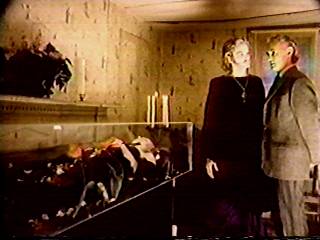 Agents of (Mis)FortuneNext morning (?), Jenny tells her father she's worried about Buster. Don arrives. They make some more small talk, which includes the missing Buster. Since Jenny's mind is elsewhere, she's not attentive to Don. He says to Roy, "We're not married yet, and already she's treating me like a husband." She says, "Don't you wish." (We assume this is what passes for slick double entendre in these parts.) The doorbell rings, and we see someone crawling into some bushes. Jenny goes to door and sees Buster hanging over the porch. Don runs out of the house (in no apparent direction) and finds the dropped key in the brook. He picks it up and sees a farmhouse (which we later learn is the Whitaker place). Later, Don tells Roy about the blood at the brook, but he doesn't mention the key. Back at lab, Don and Roy check over the dog. Roy trying to figure how to tell Jenny that Buster was drained. For old business, they've started calling their blood riddle "marked accelerated progeneration." Roy talks about the impossibility. (Yeah, like where is all that blasted extra mass coming from? Does it teleport in from the same place Banner gets his extra mass when he transforms into the Hulk?) Go to a room at a motel. A young guy enters, and a woman's voice (Lucy Grant) says, "Melvin, you're supposed to carry me over the threshold." He does so, and they fall onto the bed while The Ubiquitous Opera Theme™ cues up. They talk about watching the late show (but, once again, it looks like daylight). She goes into bathroom to freshen up. He strips down for bed. (Do we really have to watch this event?) She comes out wearing a tight teddy. He goes to take a shower. The Ubiquitous Opera Theme™ turns up. She gets busy dumping things off the bed while he starts his shower. (It might've been cool and apropos if blood started coming of the showerhead, but no go). She impatiently calls for Melvin, looks up, and sees a tight close-up of a grinning Egon. (Wait, how in the heck did he get in there?) While Melven showers, we are treated to a quick image of a blonde woman with her eyes closed. (Huh?) Egon interrupts the shower by beating the crap out of Melvin with his furin cane. The girl Melvin came in with is lying on the bed; she's convulsing. Back at Chez Anderson, Don is talking to Jenny, who is in bed. They tried to call Chief Spanno, but storms are cutting off the phone lines to Capitol City. (We learn from this scene that (1) Capitol City must be quite a distance away since they're having bad storms but it's bright daylight in Jefferson Valley, and (2) Jenny must either have a graveyard shift job or suffering from some kind of depression, because she sleeps a lot during the day. Bad "day-for-night" shooting? You decide. Aw, the heck with it. Maybe this is midsummer in Alaska.) Don and Jenny are interrupted by Roy, who is shouting, "Don, come quick! You won't believe what's happening!" Over at the Whitaker place, the two furiners in overalls are carrying two big bundles into what looks like a stable. Elsewhere, the amazingly effeminate Creton (Paul Craig Jennings), who is wearing a purple robe with an upside-down cross, is talking to an unconscious girl in a glass coffin (or a really big aquarium). This is the queen of the Sangroids. (The girl, not the guy.) Creton tells his sleeping Queen Onhorrid that the feast of Mennonite grows near, and this time they will be ready. (The ancient Druids were Amish? Wow, the things you can learn from movies!) Sontag (Richard Erickson), who looks relatively respectable compared to the rest of this crew, enters and tells Creton that Egon has brought two more. One of the overall furiners enters with a sample and they realize the girl they bagged at the motel is not the one they've been seeking. Back in the barn, they've tied Melvin down and hooked him up to a pump with a tube. They turn it on. He convulses for a while.