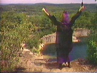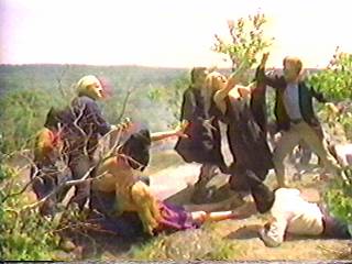 Night and DayWe've all seen bad day for night shooting. On of my personal favorites was Billy the Kid vs. Dracula (1966), which showed the public domain villain roaming the countryside at night with broad daylight. They tried to filter the scenes, but no go. And then there's the cult favorite Plan 9 from Outer Space (1958) which abruptly jumps from day shots to night shots during individual sequences. In Invasion of the Blood Farmers, they don't even try to cover their day for night shooting. Individual instances of this have been noted in the plot description, but the opening scene at the Huddle II, where the bartender tells a departing character "Good night" during broad daylight, kind of sets the tone for what will be many unintentionally surreal examples of dialogue not matching the setting. This would reach a climax of awkward silliness at near the end, when, during the nighttime Feast of Mennonite (which, by name, is silly in this context by itself), the action takes place in clear daylight. Oh, well, at least they picked an area with good scenery in the background.
