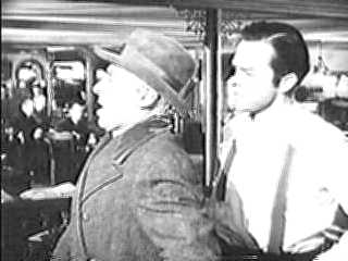 Go to a press room. A reporter called Herbert Carter (Bob Steele) tells his boss Brannigan (Douglas Fowley) that Charles Foster Kane has died. Brannigan doesn't seem too surprised. (Gee, maybe he's got something to hide, too) The official reading the will is scheduled for tonight at the Kane place. The crusty old manager sends Carter to Get The Story and find out what Kane meant by "mansion." Nighttime at the Kane Mansion again. (Isn't it ever daylight over here?) Carter arrives with his comic relief date Jane (Joyce Compton). She comments on what a spooky place this is at night. Carter tells her she should've seen it when it was new. Raymond lets them in. While they walk, Carter and Raymond talk about Kane's public image. Go to stock footage, showing how Kane suddenly rose to greatness on the money of his father, a senator from California. He went into the publishing business and did even better. (And that means lots of stock footage of newspaper presses and books.) After that, he went into other industries, particularly munitions. (Yup. More stock footage of other industries, including things like tanks and artillery pieces.) Then he built this home, so we are treated to various images of the mansion. (More like, stock footage of other mansions.) And he collected several animals. (And, apparently, stock footage of animals, too. Oh, look, he's got the rubber octopus previously seen in American (1941) and later seen in Bride of the Monster (1956). Cripes, is this whole movie going to be fixed-up footage?) They pause at the entrance to the parlor where they'll be reading the will. Raymond introduces Carter and Jane to those standing at the door. There's Dorothy the grieving widow, plus Kane's business partner Bernstein (Charles Bennet). The latter needs to ask Raymond a few questions. They walk away, talking quietly. Carter asks Jane to go ahead in. After she's gone, her tries to strike up a conversation with Dorothy. He asks her about what Kane might've meant by "mansion." Did he mean this place? However, she doesn't want to talk to the young reporter. (Heh, score one for the reporter's sense of tact.) Enter Kane's lawyer Thatcher (George Zucco). He announces that they'll be reading the will shortly. Then he takes Carter aside and asks him not to bother the widow just now. She, says Thatcher, is usually very talkative, but not today. Carter takes this opportunity to ask Thatcher what he knew about Kane's last words. And then the story goes into heavy flashback mode. Thatcher tells Carter about the time his father, Thatcher Sr., first met Kane. The scene shifts to several years earlier, when Kane was a boy. Thatcher Sr., (Zucco again, and wearing a wig so he'll look more youthful -- it doesn't work) is talking to Kane's mother Mary (Agnes Moorhead) and father Senator Kane (Harry Shannon) about the boy's upbringing. Mary says the boy should go to a private school in Chicago and get away from the barbaric, rustic life in California. (Heh. Good joke for the time.) We learn that they can easily afford this because the Kane family is quite wealthy due to some successful gold prospecting about a year ago, but the senator wants the boy to have a more manly upbringing. (Grow up wimpy in Chicago or manly in California. Gee, how times change....) While the senator continues to expresses his dislike of the idea, Mary brings out a couple of trunks. In the background of this flashback, young Kane (Robert Blake) has been playing with himself -- that is, he's playing a board game, and he seems to be the only player. Mary tells him he's going to Chicago with Mr. Thatcher to learn how to be a great man. Thatcher Sr. enters the conversation and says it's time to go. On their way out, young Kane asks the lawyer if he can have happiness in Chicago. (It's as creepy as it reads.) Thatcher Sr. says that's up to him. And the flashback flashes forward a little bit to some still shots of Chicago in the 1880's. (If it were Boston, we'd have the horrid feeling this was about to segue into an episode of Cheers.) In a comfortable drawing room. Young Kane opens a present. It's a sled with the word "Rosebud." The boy protests that he wanted happiness. Thatcher Sr., looking a little more sinister than earlier, tells him there will be time for his old happiness later. End flashback. Thatcher tells Carter that when Kane went to Chicago and lived with the Thatchers, they lived in a mansion. Carter asks if Kane ever found happiness in Chicago. The lawyer merely says, "Who can say?" Bernstein interrupts the