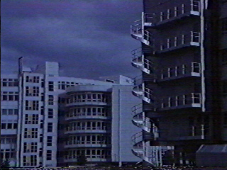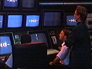 Out in the bush, the twins trudge along. Night falls. They stop walking and start to make a fire. A beautiful ball of light floats along overhead. (Or rather, somebody mattes another unconvincing cartoon light ball into the shot.) It drops to the ground and turns into Nukie. He walks to the small mound the boys put together for their fire while they tell him about their banishment. Nukie demonstrates his warmth by heating up the rocks in the mound until the fire starts. (Or rather, the filmmakers regurgitate E.T.'s trademark glowing finger trick with a poorly executed cartoon lightshow.) The alien asks the boys why they were banished. They explain how Sangoma was guided by the spirits of their ancestors, the ones who've died and gone up to the sky. Nukie says he's from the stars but never saw these mythological ancestors. "Liar!" shout the boys as they rip the evil, heretical demon to pieces and scatter the parts throughout the bush. No, sorry; that'd be another audience fantasy. Nukie tells the boys to go to sleep, but they don't want to. (We suppose it's because they think Nukie is really cool, not because they think he's as uncoool and untrustworthy as the average child molester.) But the cutesy alien tells the boys to go to sleep while he tells them the story of how they discovered sleep at his home world. (We suspect it coincided with the premier of The Postman (1997), but no go.) He presents this story as an interpretive dance (or rather, the small actor in the suit jumps around in the fog) wherein he reveals his true form (cheesy cartoon fireball) with a dazzling climax (stock footage of skyrockets exploding). (Put it all together, and it could be grotesquely Freudian. Maybe the boys will think Nukie is uncoool and untrustworthy after all.) Cut to the exterior shot of Space Foundation™. A narrator tells us the day, time, and lets us know that Carter is working on the EDDI (pat. pend.) computer. Cut...to...Carter working...on the...EDDI...(pat. pend.)...computer. (Feel...my...pain.) The computer interrupts the technician by saying, "You smell good." (Given Miko's previous interaction with EDDI (pat. pend.), we now realize that the alien is one of those illegitimate children of Captain James T. Kirk, who often broke computers by just talking to them.) After some conversation, the EDDI (pat. pend.) computer professes his childlike love for Carter. (Correct me if I'm wrong, but the when something like this happened before, didn't the computer kidnap and rape the girl?) Back elsewhere. At the village late at night, the locals are dancing around a fire. Nukie sneaks up on the party, and the boys are even sneakier nearby. (Weren't they supposed to be asleep?) Sangoma and company see the "bad god" and attack him. (Sorry, but saying "see the bad suit and attack it" is too derivative for even me.) A moment later, the alien is under a scrum of villagers. When they get up (guess what?), the alien is (guessed it yet?) gone (did you have to peek ahead?). However, a nearby motorcycle (where in the Honda did that come from?) starts up and rolls away. It runs into a jeep driven by the returning Corporal. When the motorcycle falls over, a ball of light flies away. (If he could turn into a ball of light, then why did he need the motor--aw, to Hell with it.) Cut to the exterior shot of Space Foundation™. A narrator tells us the day, time, and lets us know that the EDDI (pat. pend.) computer is analyzing data. Cut to the EDDI (pat. pend.) computer analyzing data by reciting 1's and 0's out loud. (What the hell is it doing? Loading a serial buffer one bit per second?) He announces that he's bored, so he calls for Miko. Out comes the alien. Miko asks the EDDI (pat. pend.) computer if he likes music. The computer says it doesn't know what music is, so Miko summons a delicate celestial melody. (Or rather, some atonal electronic crap starts playing. You can imagine Mike Myer's Dieter character dancing to it.) Dr. Glynn hears the sound and enters. The music entices him; the stocky middle-aged scientist strips off his jacket and dances. (Take a moment to imagine this horror. Alien takes over computer, atonal electronic music in a dark room, and a less-than-photogenic male starts dancing and stripping. On the plus side, b-movie experience suggests that a monster is about to jump out of the shadows and eat the scientist, but no such luck here.) Suddenly, Dr. Glynn admits that he has become a clown. (Nothing we suggest here can top that.) The EDDI (pat. pend.) computer says this is the circus. Dr. Glynn pretends Miko is a wild animal and leads him back to his holding area. (Therapy. We now need therapy.) Enter Dr. Rhinestone. She insults Dr. Glynn for his childlike