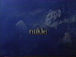 The Gods Must Be Crappy, or... Nukie (1993)(a.k.a. Nukie... In Search of America) Written by Sias Odendal (story) and Ben Taylor Like a man to double business bound, Summer 2001. A controversial announcement came from some of Steven Spielberg's associates. They were working on a director's cut for a new re-release of E.T. the Extra-Terrestrial (1982). Among the changes related to the press was how a post-post production crew was digitally removing firearms from characters and replacing them with cell phones. We laughed at what sounded like another instance of political correctness run amuck. I said that if p.c. was really the motivation for such a complicated retrofit, then, by logical extension, all firearms should be removed from all Spielberg movies. Result: Saving Private Ryan (1998) with grown men running around World War II France pointing their fingers and making "Bang! Bang!" noises. Should the makers of Nukie wish to use computer graphics imaging to retroactively enhance their movie, we recommend they digitally remove the whole movie. ContentsThe Plot1. The Muppet Who Fell to EarthWe open with a shot of a spiral galaxy and two traveling balls of light. The pair of giddy globes talk to each other. (Dang, didn't Cape Canaveral Monsters (1960) start out like this? And to make matters worse, they speak like bad amateur night versions of Hervé Villechaize.) After some sparkling repartee like "Watch out for that asteroid!" and "Water and wind are dangerous!" one of the orbs drops past a jet airliner in flight over the Earth. Elsewhere, two men are watching some monitors. (We're not sure what we are looking at here. At first glance, we'd assume they're air traffic controllers, but they have monitors showing the entire United States and a single item clearly labeled "UFO." There are some other monitors in the room, but they have this same show on. Perhaps this is NORAD as imagined by people limited by budget and experience.) One of them says it's over Florida, and the other says it's going 250 miles a minute. The track on the screen moves west, and then it's over California. (That was done in a few seconds. For people not familiar with the United States or basic math -- which seems to include the filmmakers -- to travel from Florida to California in a few seconds would require a speed of 250 miles per second, not minute.) The ball of light innocently flies over one of the great cities on the west coast. (Or rather, a tacky special effect is achieved when they superimpose a ball of light over footage of a metropolitan area which may or may not be on the American west coast.) Suddenly, it's over Florida again (heh), where it crashes. An alarm goes out. Various unidentified vehicles, at least one of them with a NASA logo, scramble out to the crash site. (Or, rather, an actor in voiceover tells some stock footage to go to the crash site. We're not sure if they actually go there, though, because the movie doesn't show us anything, not even stock footage, resembling this.) But another track is on the monitors. (No one in this monitoring center considers that this may be the same one they were following earlier.) It flies further east than the first one and stops in central Africa. (Or rather, instead of a cheap representation of the United States with a single track, we get a cheap representation of central Africa with a single track.) Elsewhere, Dr. Eric Harvey (Steve Railsback) receives a call telling him to go to the landing zone of the other UFO. (Or rather, the same voiceover as before orders some footage of Mr. Railsback to do so. In the footage in question, the actor looks like he's just had a rude wake up call. Must be reading this script.) But first, in the United States (or something like that) they've recovered the thing that crashed in Florida and taken it to NASA (or something like that; it's a walled industrial compound with a sign on an arch claiming to be NASA). At the Space Foundation™ (which seems to be a stock footage shot of some buildings and what they call NASA in these parts), a team of technicians observe the recovered thing from the crash site: a cute simian alien. They monitor this resident alien with advanced sensors. (Or rather, someone has applied common color polarizations from the seventies with some digital noise to some shots of a muppet that looks like the bastard child of Yoda and a chimpanzee.) A middle aged white guy called Dr. Glynn ( Lester C. Muller) puts Dr. Barbara Rhinestone (Reed Evans) in charge of the creature, which (suddenly, inexplicably) has an oxygen mask. The creature quietly cries out, "Nuk-ie!" Elsewhere, another alien of the same kind lies on the ground, outdoors in the darkness with fog. Run opening credits, superimposed mostly white Times Roman, denoting a (supposed) sense of class. (The credits begin with "Glynnis Johns in" while showing us the alien, leaving us to fear that the lady's physical features have severely deteriorated.) After a while, the little fellow who might as well be called Nukie opens his bright blue eyes and stumbles around looking for Miko, which we understand is the guest of the Space Foundation™. (We were worried that Nukie was shouting for Meco and a disco version of the theme from Star Wars was about to follow.)