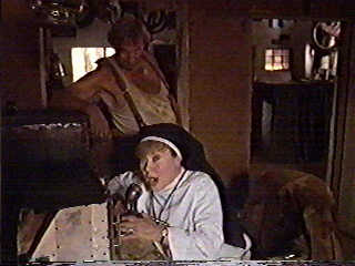 Harvey fly to Africa in this thing? In one day?) 2. The Doctor Doolittle RaidAt a mission in Africa, Sister Anne (Glynnis Johns) talks to her associates on a radio. They tell her to expect Dr. Harvey, who will be bringing in supplies. The nun's grungy handyman, known only as The Corporal (Ronald France), sips on some cheap wine during this conversation. The nun's dispatchers ask her if she's seen any unusual creatures. She says no. Then she tells her associates that Dr. Harvey will not be welcome. (We don't see the logic of this, and after watching the movie a couple times, we don't think it was ever revealed.)