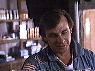 Back elsewhere. Nukie, tired, whines about his current existence. (He could save everyone a lot of pain if he'd turn into a ball of light and fly to Miko. But we've got over an hour of runtime left, so put your money on odds against that time saving insight.) Cut to the exterior shot of Space Foundation™. A narrator tells us the day, time, and lets us know that Dr. Rhinestone is continuing her stress tests on the subject creature. Cut to a shot of Dr. Rhinestone continuing her stress tests on the subject creature. (::Sigh::) Miko cries out to Nukie. Back elsewhere. The ground opens up. (But it makes the sound of branches bending.) Nukie sticks his hand up out of the ground and calls for Miko. The sky turns dark. A wind starts. The animal kingdom panics. (Or rather, the movie shows us footage of animals in motion.) At the mission, the windstorm knocks over a few things. Sister Anne runs outside and watches them fall. (This is not to say her presence during this emergency is totally inactive. She does cross herself, which is apparently more important in this movie's form of Catholicism than actively stopping things from falling over.) Inside, The Corporal is on the radio. The (mysterious unseen) operator on the other end of this radio conversation tells the lackluster laborer about a ball of fire that fell from the sky. (We suppose they mean the stuff at the beginning of this movie, as opposed to, say, the Hindenburg or the Tunguska meteorite.) The villagers seek shelter (from the suddenly blue sky), so they run into the mission. (It's decorated with beer advertisements, so we're left wondering if this is the public section of the mission. We later learn The Corporal has a trading post in the mission.) The Corporal expresses his displeasure at all these locals suddenly rushing in, and an English speaking chimpanzee wearing a tank top expresses his displeasure, too. (Sudden talking chimp. Fine. Don't know what kind of dangerous drugs the filmmakers were on, but I'm glad I managed to avoid them during college.) However, the roof starts to collapse. (Or rather, a stage hand throws a bunch of dust at the extras.) Sister Anne tells them to get out before the roof falls on them. They all leave. (So, the whole point of this scene was for us to learn that there's a talking monkey in this movie?) Back elsewhere. Nukie gets up and goes jogging. No, wait. Nukie gets up and starts running to Miko. That's it. He encounters a couple of baboons. They tell him (yup, what I just said) to go talk to their king. (We note at this point that Nukie has a runny nose. We aren't told why. We wish it'd stop. Much like this movie.) Nukie goes to the king baboon (who's got nothing on King Louie) and asks him if he knows where America is. The king says he doesn't know anything about an America, but he has a cousin in the human village who might. This cousin, says the king, wears human clothes. (The baboon' cousin is a chimpanzee? I've heard of mixed marriages, but, well, let's not worry for who's the monkey's uncle.) As Nukie leaves, the king tells him to beware the humans, for they have guns and like to kill. This greatly distresses the snot nosed alien. And Nukie is on the road again. But it isn't long before he encounters two hunters (Nohaupe Pheto and Meshak Dlamini) armed with bows. One of them nocks an arrow, draws, and aims. But Nukie panics (Don't know why he'd panic, because we doubt he'd know for a bow.) and sends forth an ethereal bolt at the aiming hunter. (Or rather, a silly animated zig-zag runs around on the actor.) The hunter goes catatonic. His friend tries to shake him out of it, but the targeted tribesman falls over, with his arrow still nocked in a bow still dawn. The free hunter carries his stiff friend back to the village. At about this time, Dr. Harvey arrives at the village in a helicopter. (Damn, Railsback himself is coming into this picture late. We'd suggest he might've been sleeping one off, but we've already used that gag in another article.) While the villagers try to stand-up the immobile archer, Dr. Harvey makes small talk with Sister Anne, who tells him he should go back to America. Dr. Harvey smiles it off while getting into a horse-drawn carriage made from the back of a car. (Horsèd carriage? Why not?...) Meanwhile, Nukie arrives at the store/mission. The chimpanzee greets him and they make cutesy small talk for a little bit. However, just as the chimpanzee offers the alien some candy, The Corporal enters with a hunting rifle. This frightens Nukie into his energy state, and he flees. (Or rather, a poorly conceived animation is applied to his image in the film and an even worse animation "flies" away.) The chimpanzee calls the human an idiot and tells him to leave, but the human doesn't seem to know what the shirty simian is shouting. (Where's Mowgli when you need him?) After The Corporal leaves in pursuit of the light, Nukie comes back in the other way. Elsewhere, Tiko and Toki are walking in the bush. They see a lioness and properly freak. They try to get away, but the lioness corners them. Enter Nukie, stage right, in a hurry. (We don't know who he was running from. Perhaps the chimpanzee tried to give him fashion tips.) He sees the big carnivorous kitty and gestures to her to calm down. She mistakes him for a big fat mouse and eats him. The end. No, sorry, that'd be wishful thinking over here. The big cat responds to Nukie's calming gestures by lying down and going to sleep. The boys make a run for it, but Nukie yells at them in a variety of human languages. (Gee, Nukie's a proto Pentecostal. Who knew?) Finally he shouts in English and the boys stop running. (Or he shouts at them in their native language. Which might have been English. Yes. One of those lost civilizations you keep hearing about in movies, where they've never had contact with Western civilization yet they already speak English when the Brits show up. We digress...) Nukie explains to Toki and Tiko that he's looki