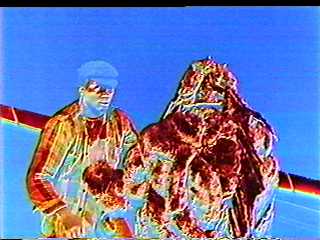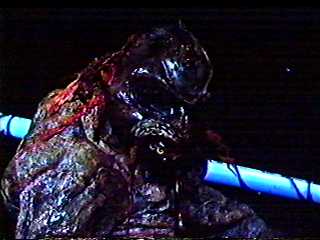 But wait! Chris, whose maimed midsection resembles a spilled quart of strawberry jam, is still active enough to hit the critter At a Slithis's Pace™ in the back with an axe. While the annoyed monster reaches back to pull this annoyance out, Chris hits it At a Slithis's Pace™ with a small anchor, apparently driving a fluke into its shoulder. OK, this, for some reason, does the trick. We are treated to a negative image, which means either the editor has finally flipped out from the banality or this is some kind of moment of truth. The mighty Slithis spawn falls At a…oh, you know. It drops to the deck, and the moment is preserved for eternity as a freeze frame. (No, that's not flowery speech in the last sentence. It really does seem like an eternity.)