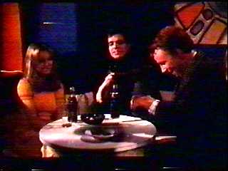 to the living room, telling him they'll be out shortly. Long Distance is the Next Best Thing to Being ThereAs soon as their guest is in the next room, Dr. Monserrat says quietly, "Close the door." Michael does so. Estelle and her husband are excited. They can control his mind. Quickly, they think of something else to test this and, through telepathy, tell Michael to go into the kitchen. He does this. They try to think of something else. Estelle suggests picking up an egg from the the refrigerator. As Michael reaches for for it, Estelle quickly specifies third from the left. Michael counts it out and picks it up. Now what? "Break the egg!" shouts Estelle excitedly. Michael crushes it in his hand. Dr. Monserrat and Estelle suddenly look at their hands in surprise. They can feel the wetness of the crushed egg.. (Yif! Good thing they didn't suggest anything with the stove.) Then Michael rinses his hand under the kitchen faucet. The hypnotists stare at their hands in disbelief. Whatever their subject experiences, they will subjectively experience. Dr. Monserrat decides he wants to test this at a greater distance. He and Estelle go to Michael, who apologizes for breaking one of their eggs. The doctor tells the young man to leave this place and go about his business, remembering nothing. As soon as Michael is out the door, Dr. Monserrat and Estelle sit down at their table and join hands. Michael walks down the street. Dr. Monserrat and Estelle are still aware of his sensations. He goes back to the dance club. They can hear the music. He rejoins Nicole and Alan and takes a swig of beer. Dr. Monserrat makes a face. "Ugh! Horrible stuff." Alan excuses himself for a moment, leaving Michael and Nicole alone. Dr. Monserrat and Estelle try to think of what to do next. The doctor has an idea. (Oh, get your mind out of the gutter. There's not enough room 'cause I'm there already.) Michael tells Nicole they're leaving. They quickly write a note for Alan and take off. Later, Nicole and Michael get out of a cab. She asks what they're doing here. He says they're going for a swim in an indoor, heated pool. They sneak past a sleeping security guard to the pool. She says she never knew about this place. He says he didn't either; it just came to him. They strip down to their undergarments and dive in. Back at the Monserrat home, the elderly couple revel in the sensation of swimming. Finally, Estelle declares it's too exhausting. Dr. Monserrat tells her they can give up control of the boy and get it back later. They relax. While Michael continues his swim with Nicole, Dr. Monserrat excitedly tells Estelle about the possibilities. For example, a volunteer could go on a long trip and transmit his sensations to people at home. The doctor excitedly plans to write a report on his test results. (Heh, hope his report writing is better than his advertising.) However, Estelle stops her husband in mid-thought and asks about the control. He acknowledges it, but she drops her pleasant demeanor while contemplating what this could mean. Then she reminds him about how he was discredited by a reporter and they'd been living in near poverty for years. This is their chance to have something special. So she asks her husband to hold off on his report while they can still control Michael. Only for a little while, she says. The doddering doctor very reluctantly gives into his loyal wife and assistant. Only for a little while, he says. Michael takes Nicole home. He asks to come up. She kisses him and says goodnight. The next day, Estelle is walking down the street when she sees something that catches her eye. In the window of a store is a fur coat. She looks at it and smiles. Later, she tells her husband about the coat. It's sure to be insured, she says. They won't really miss it, she rationalizes. Dr. Monserrat sadly gives in. Just this once, but no more, he says. That night, Michael goes to Nicole's place to pick her up for a date. She's nearly ready; that is, she's just stepped out of the shower and is wearing a towel. Her state of unreadiness amuses Michael. He sits down to look at a magazine while waiting for her to be more ready. At the Monserrat home, the elder couple begins concentrating. Michael looks up, puts down the magazine, and quietly leaves. Nicole comes out of her room and sees that Michael is gone. She rings a garage. A mechanic called Rob (Alf Joint) answers the phone and calls Alan to the phone. After a short conversation, Alan is ready to beat feet out of the garage to go on a date with Nicole. Rob gives him his blessing, with the proviso that she's on the pill. Michael walks down a dark street. Estelle is directing him. He stops at a door and forces it open. Unfortunately, he sets off a burglar alarm. Estelle gasps in shock. Michael quickly shuts it off. Then he tries to open the window display where the fur coat is. This would be about the time that a Metropol cop shows up to investigate the open door at the store. Estelle is terrified. Michael hides. As the policeman walks past where Michael is hiding, Estelle's terror turns into thrilled ecstasy. Dr. Monserrat, on the other hand, is showing no emotion beyond pure concentration. Meanwhile, Nicole and Alan have gone to the night club. Alan admits he feels strange taking her out because she's Michael's girl. Nicole tells Alan that she doesn't love Michael. Back at the store, the policeman is apparently satisfied there's no one around to ask, "What's all this, then?" He moves on. Michael resumes opening the display panel. He reaches for the fur coat, but cuts his hand. Both Dr. Monserrat and Estelle jump at the pain. Michael goes outside, drops the coat into a trash can, and moves on. Dr. Monserrat reminds Estelle to pick up the coat in the morning. Estelle, on the other hand, is still excited from the experience - especially the part where the policeman came by. She enjoyed it, and tells her husband that she knows he enjoyed it, too. He denies this. She insists t