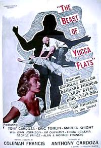 11:10 AM: The Beast of Yucca Flats (1961) I immediately picked this film to sponsor when Andy Freeberg passed on the list of available titles. First, it’s been reviewed here. Second, Tor Johnson is a B-Fest demi-god. Third, it’s simply a craptacular motion picture. Renegade Soviet Scientist Johnson somehow gets his 400 hundred pound self out of Russia and defects to the US. Unfortunately, two of the USSR’s "most ruthless" agents intercept his oddly light protective detail. Johnson flees the scene, albeit at the rate of about ten yards an hour—mobile, the guy ain’t—when an atom bomb test occurs. His pursuers are killed, and Tor is transformed into a scarred, animalistic killer. Made by the infamous Coleman Francis, Beast is one of the most hilariously awful films ever made. Its most famous element is its lack of recorded dialogue. Instead, Francis himself narrates the film with uproariously portentous snippets addressing Various Grave Matters. "Touch a button," he barks, as Tor is A-Bombed. "Things happen. A scientist becomes a beast." One of the film’s lawman heroes—who spends five minutes trying to gun down a random guy he sees, since he might could be the killer—is described this way: "Jim Archer. Another man caught in the frantic race for the betterment of mankind. Progress." I was disappointed to see that the incredibly gratuitous nude scene—filmed later, sans Tor, it actually can not have occurred anywhere in the continuity of the film as presented—that kicks the movie off on the DVD was replaced, but hey, them’s the breaks. Classic stuff.