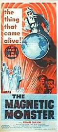 3:10 The Magnetic Monster (1953) A really intelligent, low-key sci-fier written by Curt Siodmak, and easily ahead of its time. A government investigative team of scientists looks into a seemingly benign magnetic anomaly before learning that it could ultimately destroy the planet. This was one of several interesting pictures from that period featuring non-sentient threats to the world, including Kronos and The Monolith Monsters. The end of the film was obviously stock footage from some previous film, as indicated by the way they cut away any time faces were about to come into view. Given the design of the scene, I pegged it was being from a German silent, and thus deduced, from the sheer scale of the stuff, that it might come from Gold. I proved right, so I get had a cookie. The cast is filled with great and familiar character actors, including Richard Carlson, King Donovan, Byron Foulger and many others. The investigative scientists act in a no-nonsense but naturalistic fashion, ala the then popular Dragnet, and they and the subject matter foreshadow such later shows as the original The Outer Limits and The X-Files. However, my fears that it was too quiet to hold the interest of the audience at this juncture were proven correct when people started to shout "END!!" up at the screen. Good stuff, though, I wish it were out on DVD.