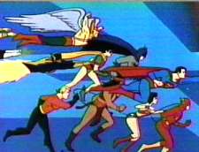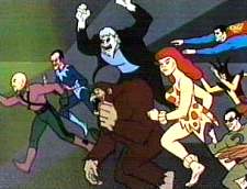 Back at the Hall, the Legion has somehow failed to notice the whole "Earth’s billions reverting to normal" thing. I think I now understand how they keep failing to conquer the world. Instead, they open their doors to allow another group of Bizarros and Cheetahs in. In a neat twist (cough, cough) on the scene where the Superfriends were fooled by the disguised villains, these pull off masks—where the hell did they get those?—to reveal themselves to be the Justice League. Is that the only way they could get back into their own hall? Don’t they keep a spare key under a fake rock or something? Anyway, Superman’s hair is suddenly colored yellow. That’s some good quality control on the animation there, I must say. Actually, there’s a lot more questions here. Where did they all get Superman/Bizarro costumes for their disguises? And why were they wearing them, when everyone who transformed into a bogus Bizarro or Cheetah remained in their street clothes? And how does pulling off a mask instantly switch you into your ‘real’ costume? And how did Hawkman manage to hide his wings in a shirt? Anyway, a short ‘battle’ breaks out. Sort of. See, because this was a ‘70s kids’ cartoon, the characters are never allowed to hit each other. At best combatants would grapple or wrap their arms around each other. At one point, Bizarro wraps Batman and Robin up in a steel girder. (I’m amazed they could stand with this thing tied around them.) Batman tosses a Batarang, which boomerangs around and saws through the thick metal. Please. Why not just have him use his Bat Magic Wand. Then Batman pushes the exact same button on his belt that was earlier identified as the Batmobile Remote Control. This unleashes a plastic ball that envelopes Bizarro and traps him. Which means that this same gimmick would work on Superman. Yeah, I’m buying that. And, of course, we never see Batman use this device again. Luthor’s not ready to admit defeat yet, though, for he still has his Dream Machine from earlier in the show. Two things. First, for some reason it’s now drawn three times larger than it was before. Second, I thought this thing took control of people when they were sleeping. So what good would it do at this point? Apparently they thought we couldn’t remember that far back, though, for now they imply it can control awakened folks as well. Instead, Superman grabs it—oh, yeah, the super-speed thing; funny how Superman only uses it at the tail end of episodes, like now—and turns it against them. He orders them to surrender to the authorities. (Leaving the question of how they could possibly contain Grundy or Sinestro or…whatever.) They don’t bother to actually escort them off, though. So later Lex calls them on their viewscreen to explain how he programmed the device so that it wouldn’t work on them. What’s scary is that both the Legion and the Justice League supposedly sport some of the greatest intellects in this universe. Yikes. By the way, neither the Dream Machine or the Paralyzing Beam would ever be employed again. In the world of bad Saturday morning cartoons, such devices can only be used once and then you’ve got to come up with something else. Summary: A worthy start to a, er, memorable series. SuperReaders' Respond! In one of your recent Superfriends reviews, you lament the recent decision [i.e., in the Cartoon Network's generally superlative new Justice League cartoons--Kibitzer Ken] to give Wonder Woman the power of flight. While I too have traditionalist leanings, this isn't really as recent an innovation as it seems. In the comics, since as long ago as the late fifties/early sixties, WW has had the power to "ride the air currents", which, translated into actual English, means "She can fly without the damn plane when it's convenient to the plot". Even then, the Invisible Robot Plane (boy, that's fun to type!) was still necessary for flights that involved greater speed and/or distances. Television writers seemed greatly enamored of the plane, though, so they generally chose to ignore the fact that Wonder Woman has been able to fly without it for a long time. On a similar note, there's another comic-to-television hiccup re: Wonder Woman's powers and gimmicks. The Magic Lasso's power was originally to make anyone tied up in it Do Whatever Wonder Woman Commanded (insert your own joke here). Again, television writers stepped in, thinking that using the lasso this way made WW too powerful. So they seized on the fact that she often used it to force information out of criminals and decided that its actual power was the ability to force its captives to tell the truth. Post-seventies comics writers have followed suit, for better or worse. The tail wags the dog. Not that you asked... I'm sorry, have you seen my life around here anywhere? Oh, yeah, and I realize, of course, that the power to "ride the air currents" still wouldn't mean [marginally altered expletive deleted]-all in the vacuum of space. Stupid cartoon!" Jabootu tips his hoary horns to correspondent/proofreader Bill Leary for his notes on this article. As a non-fan of superheroes, the perplexed Mr. Leary also raises the following questions: In regards to Green Lantern's inability to effect yellow objects: "So, if it's so dark that color vision isn't working (say a moon-lit night) did it still not work? And if it's partially yellow, what happens? I mean, Flash's costume was red with yellow accents. If the Flash gets konked on the head and is falling, can he use his big green baseball glove to catch him, or will he fall through it? Can he whack a traffic light while it's red or green, but not when it's yellow?" -by Ken Begg |