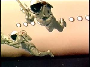 Rankin contacts Space Command and fills them in. He intends to evacuate the station, and requests tight quarantine for the arriving personnel and equipment when it arrives on Earth. (Yeah, you’d think.) Then he requests permission to destroy the Gamma 3. Eliot and everyone else appears shocked by this, although with the creatures infesting the station by the hundreds, I’m not sure what the hell else they would do. Of course, Eliot argues against it, and Rankin remains stalwart, etc., etc. You’d think Eliot might want to shut up after a disobeying direct order, with the result that a good chunk of the station has been vaporized, but I guess not. Eliot attempts to interfere again. (Again, how did this utter moron ever become the commanding officer of a gigantic space station?) Rankin orders him escorted to an evacuation vehicle, and to be placed under arrest if he offers up any further resistance. Eliot gets so tetchy at this that he takes a swing at Rankin. Of course, he’s not he-man enough to actually land a blow, and merely ends up getting socked in the face before being ushered out. General Thompson gives the OK for the station to be destroyed. However, the evacuation is blocked because the exterior of the "escape hatch," through which the vehicles are to leave, is crowded with slime monsters and won’t open. (Again, the effects here are awful. I actually believe the ‘monsters’ we see gumming up the hatch are finger puppets.) I guess that means that if this part of the ship had been destroyed, rather than C Block, that there would be no way at all to get the personnel off. The situation is reported to Rankin, who orders a party of four men sent outside to clear the monsters off. Of course, Eliot has proved such a noodle that the only course left for him is a Tragic, Redemptive Death. Therefore nobody is watching over him, and he is free to set things in motion. Having donned his spacesuit, he shows up and assumes command of the team. Lisa then pops in for the obligatory Tearful Last Farewell. She attempts to stop him, whereupon he barks, "Now don’t you tell me what to do! I’m tired of being told what to do! I’m tired of taking orders!" Well, then, maybe you shouldn’t have joined the friggin’ military, you ass. As if this doesn’t all nauseate us, then he whines about how Lisa never really loved him, she still loves Rankin, blah blah. Gad, what a dip. And so the team sets out, via a truly mind-bogglingly horrible array of clumsy wirework, inept bluescreen effects and laughably unconvincing miniature work. Obviously it’s more than a little unfair to compare the stuff here to modern effects work. However, even based on contemporary standards, it’s woeful stuff. After all, The Green Slime came out the same year as 2001: A Space Odyssey. No, the problem is basically that the script wrote some pretty big frickin’ checks, ones that were way beyond the capacity of the film to cash. Soon the party has landed on the hatch and begun blasting the monsters,