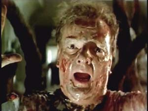 at this point it’s apparently held it for several hours.] Rankin makes to give the command, and Eliot attempts to stop him. "There must be another way!" he protests. (Dude, we don’t even know what the first way was yet.) Rankin, as usual, doesn’t have much patience for Eliot’s constant dillydallying. "When you think of it, let me know," he sneers. It’s really kind of hard to argue with him there. Then he gets on the microphone and issues the following order: "Prepare to evacuate C Block immediately, and make ready to drop the air lock panel!" Listen, I realize I’m a bit dense, but wasn’t that the original friggin’ plan?! In fact, wasn’t C Block supposed to be evacuated before you tried to lure the creatures into the storeroom? Yeesh. At this point Halversen appears, yelling that he has to collect his "papers." Apparently the idea of back-up computer discs, not to mention networked computer systems, has gone out of fashion. When Rankin denies his request, Halversen disobeys and runs down the hall to his lab. Those wacky scientists, huh? Meanwhile, Lisa has shown up too, and again, I have no idea why she’s here. Shouldn’t she be seeing to her patients, some of who are presumably in distress after the emergency evacuation? Meanwhile, a monster pretty much literally pops up right behind Rankin. I guess maybe it’s supposed to be the one that was in the sickbay, and it broke out. Or something. The party backs away, and then the rest of the monsters smash down the storage room wall and join in the attack. Luckily, guys in cumbersome rubber monster suits can’t move very quickly, and the crew mostly manages to stay out of their electrified grasp. However, Halversen shows up with maybe half a dozen file folders—that’s his lifetime of work?—and in a panic runs in front of the power cart. This sends the thing careening out of control down the hall…sort of. I really think they had only built maybe twenty or thirty feet of hallway, and thus again the camera stays really tight on things in an effort to hide this. Even so, it gets through, and the air lock button is pushed, and the door comes down, and Rankin has to do a purportedly exciting Indiana Jones leap and roll across the floor it to reach safety. Sadly (well, sort of), though, Halversen is still bumbling around on the other side of the door, desperately dodging the creatures. Well, that’s what happens when you ignore the hero’s orders. There’s another air lock door that can be deployed further down the hall, but the errant power cart is now wedged under it. Rankin orders it moved, and the men struggle to muscle it aside. Meanwhile, Eliot argues that they must raise the first door to save Halversen. Rankin predictably, if logically, shoots this idea down, as it might allow the monsters loose to threaten the entire the station. Eliot, who really is proving to be sort of an idiot, decides to take things into his own hands and goes to throw the switch. Rankin levels a gun at him and orders him to stand down. Sadly, though, when Eliot continues down the hall Rankin is stymied by Lisa throwing herself in the way. At this point you really want Rankin to just shoot both of them, but of course he doesn’t. However, when the door opens, it’s merely to set up the film’s most famous shock sting, as the face of Halversen’s mutilated and burned corpse fills the screen. Eliot pulls Lisa back, because she’s a girl and can’t do so on her own. Rankin covers their retreat by firing on the monsters, despite the fact that this will result in more of the beasties in short order. (Actually, that’s not necessarily true, if they can contain the monsters in C Block and then cut all the power there.) Luckily, the monsters are distracted by the power cart, and Martin manages to drop the second air lock door. However, for some reason (It’s In the Script) there are numerous barrels of flammable material stored behind a nearby wall panel. The sparking tentacles of the monsters manage to set these off, and a good portion of the station explodes, resulting in massive, billowing flames. That’s right, flames, in space. These are still seen about half a minute later when we cut to an exterior shot of the damaged Gamma 3.